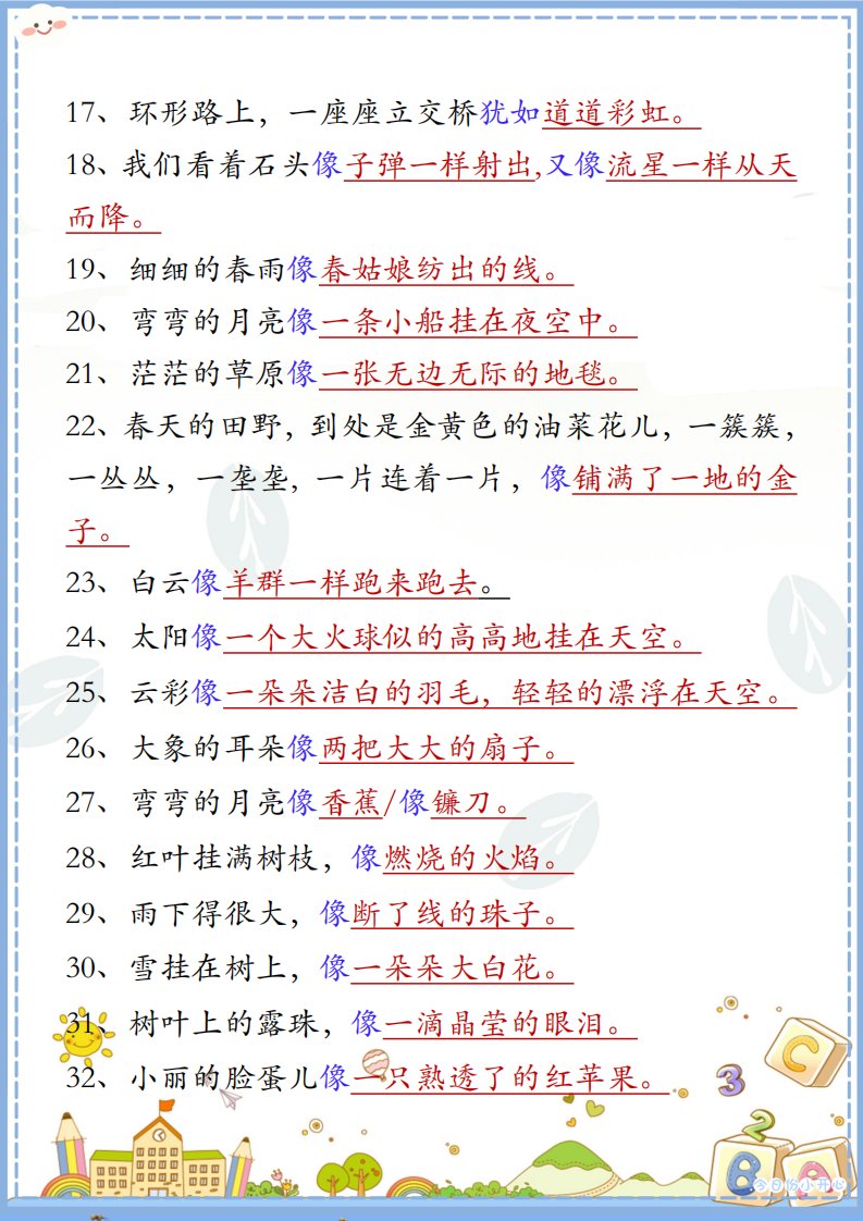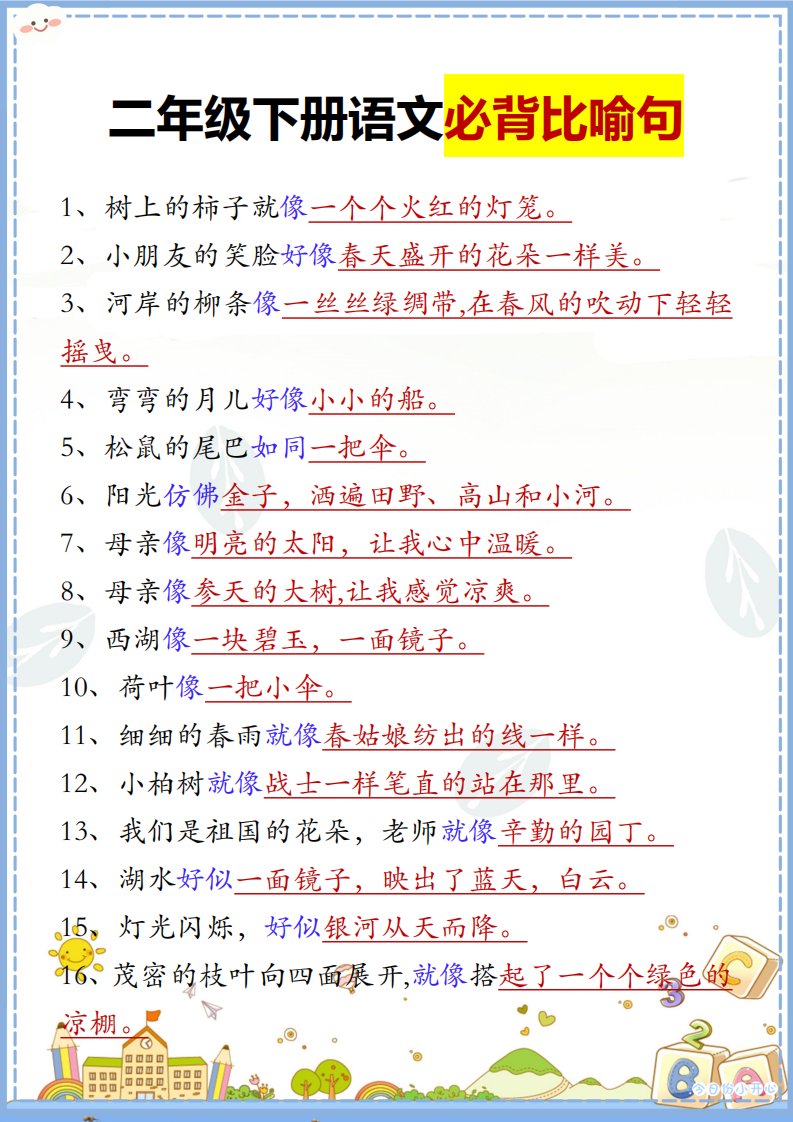 当前位置: 首页小学资源小学二年级正文 二下语文【必背比喻句汇总】_共2页 小学二年级 1 周前 0 0 5 以上为部分内容预览,如需源文档请登录您的会员账号进行下载! 声明:本站所有文章,如无特殊说明或标注,均为本站原创发布。任何个人或组织,在未征得本站同意时,禁止复制、盗用、采集、发布本站内容到任何网站、书籍等各类媒体平台。如若本站内容侵犯了原著者的合法权益,可联系我们进行处理。 尚学资源永久会员 打赏 收藏 海报 链接