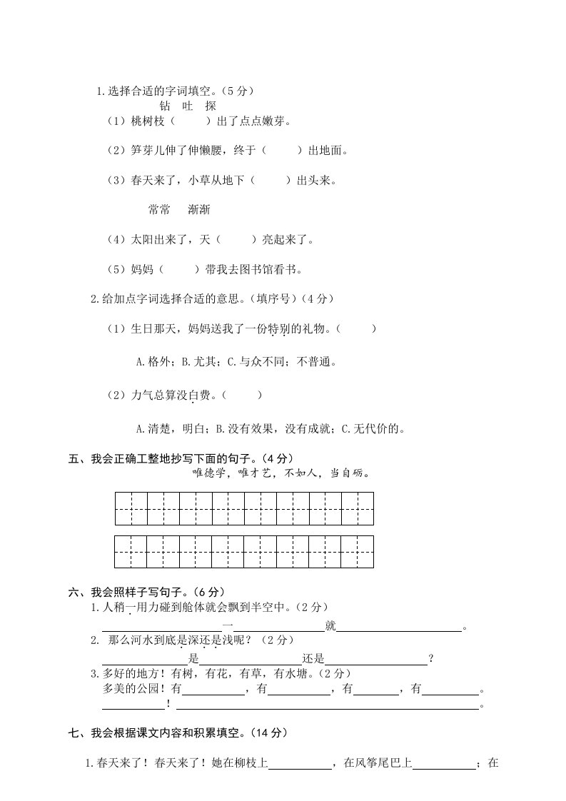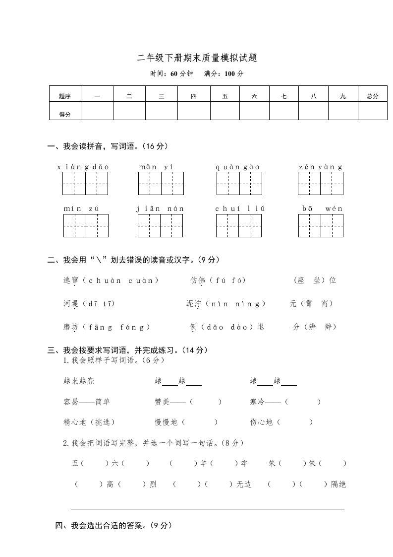 当前位置: 首页小学资源小学二年级正文 二年级语文下册期末试卷14_共5页 小学二年级 1 周前 0 0 5 以上为部分内容预览,如需源文档请登录您的会员账号进行下载! 声明:本站所有文章,如无特殊说明或标注,均为本站原创发布。任何个人或组织,在未征得本站同意时,禁止复制、盗用、采集、发布本站内容到任何网站、书籍等各类媒体平台。如若本站内容侵犯了原著者的合法权益,可联系我们进行处理。 尚学资源永久会员 打赏 收藏 海报 链接