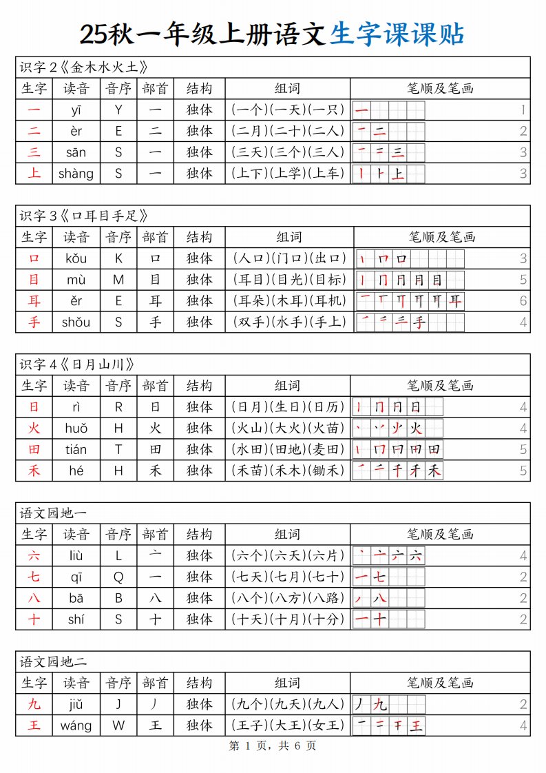 25秋一年级上册语文生字课课贴(6页)_共6页