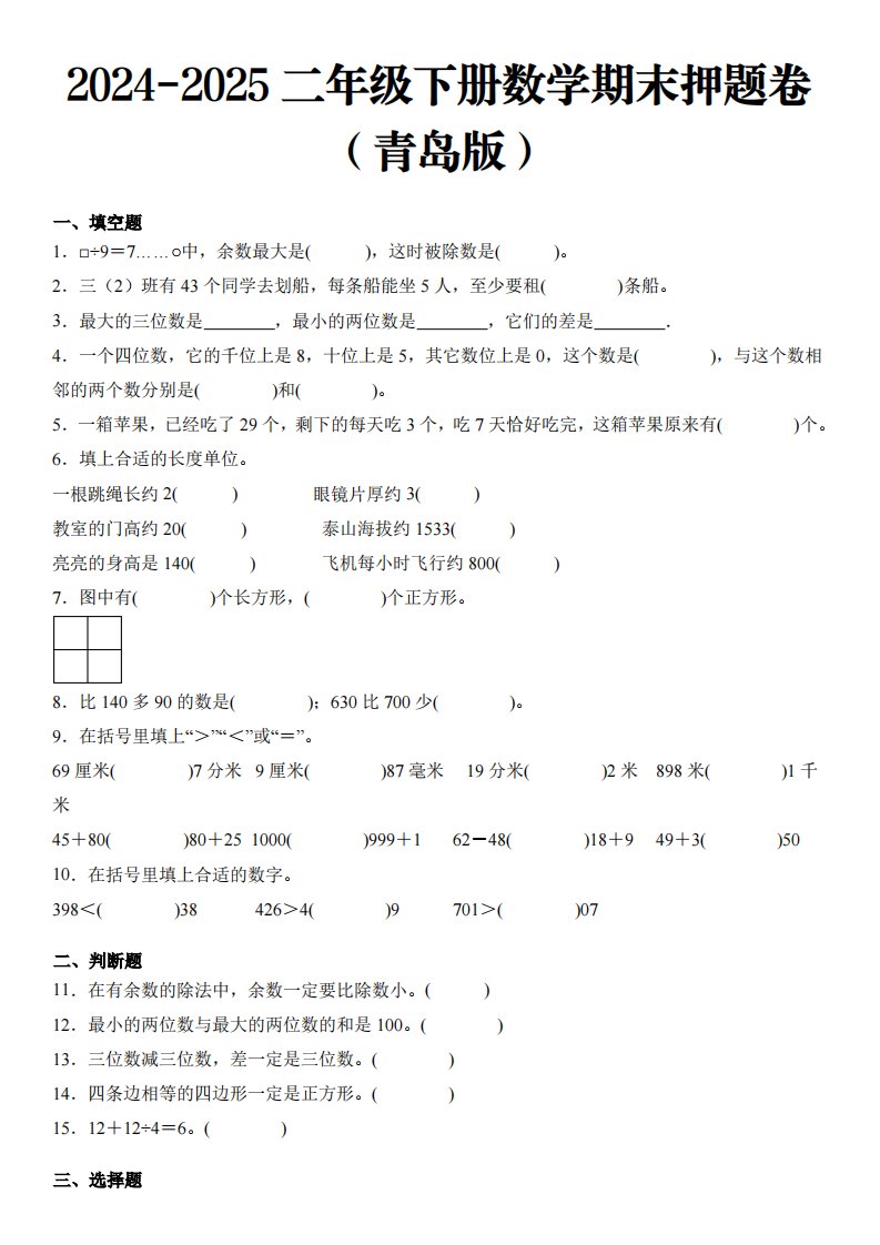 当前位置: 首页小学资源小学二年级正文 2025二年级下册数学期末押题卷青岛版_共11页 小学二年级 1 周前 0 0 10 以上为部分内容预览,如需源文档请登录您的会员账号进行下载! 声明:本站所有文章,如无特殊说明或标注,均为本站原创发布。任何个人或组织,在未征得本站同意时,禁止复制、盗用、采集、发布本站内容到任何网站、书籍等各类媒体平台。如若本站内容侵犯了原著者的合法权益,可联系我们进行处理。 尚学资源永久会员 打赏 收藏 海报 链接
