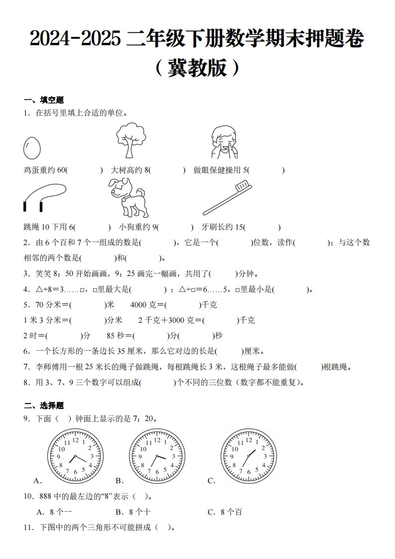当前位置: 首页小学资源小学二年级正文 2025二年级下册数学期末押题卷冀教版_共8页 小学二年级 1 周前 0 0 5 以上为部分内容预览,如需源文档请登录您的会员账号进行下载! 声明:本站所有文章,如无特殊说明或标注,均为本站原创发布。任何个人或组织,在未征得本站同意时,禁止复制、盗用、采集、发布本站内容到任何网站、书籍等各类媒体平台。如若本站内容侵犯了原著者的合法权益,可联系我们进行处理。 尚学资源永久会员 打赏 收藏 海报 链接