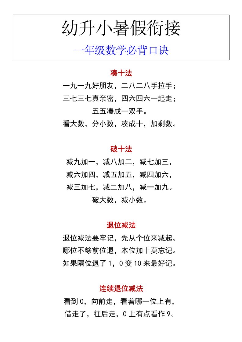 当前位置: 首页小学资源小学一年级正文 幼升小暑假衔接一年级数学必背口诀_共4页 小学一年级 2 周前 0 0 5 以上为部分内容预览,如需源文档请登录您的会员账号进行下载! 声明:本站所有文章,如无特殊说明或标注,均为本站原创发布。任何个人或组织,在未征得本站同意时,禁止复制、盗用、采集、发布本站内容到任何网站、书籍等各类媒体平台。如若本站内容侵犯了原著者的合法权益,可联系我们进行处理。 尚学资源永久会员 打赏 收藏 海报 链接
