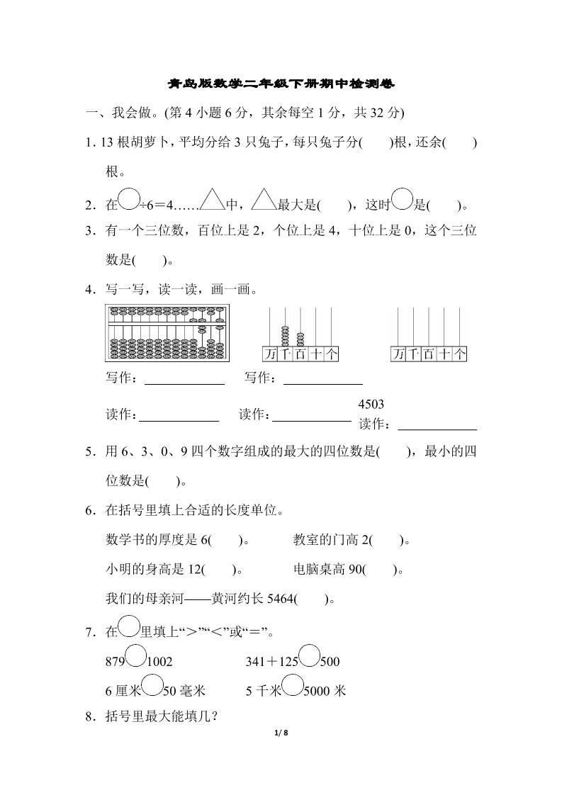 当前位置: 首页小学资源小学二年级正文 二下数学青岛63期中检测卷(含答案8页)_共8页 小学二年级 1 周前 0 0 5 以上为部分内容预览,如需源文档请登录您的会员账号进行下载! 声明:本站所有文章,如无特殊说明或标注,均为本站原创发布。任何个人或组织,在未征得本站同意时,禁止复制、盗用、采集、发布本站内容到任何网站、书籍等各类媒体平台。如若本站内容侵犯了原著者的合法权益,可联系我们进行处理。 尚学资源永久会员 打赏 收藏 海报 链接