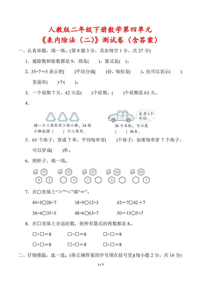 当前位置: 首页小学资源小学二年级正文 人教版二年级下册数学第四单元《表内除法(二)》测试卷(含答案)_共7页 小学二年级 1 周前 0 0 5 以上为部分内容预览,如需源文档请登录您的会员账号进行下载! 声明:本站所有文章,如无特殊说明或标注,均为本站原创发布。任何个人或组织,在未征得本站同意时,禁止复制、盗用、采集、发布本站内容到任何网站、书籍等各类媒体平台。如若本站内容侵犯了原著者的合法权益,可联系我们进行处理。 尚学资源永久会员 打赏 收藏 海报 链接