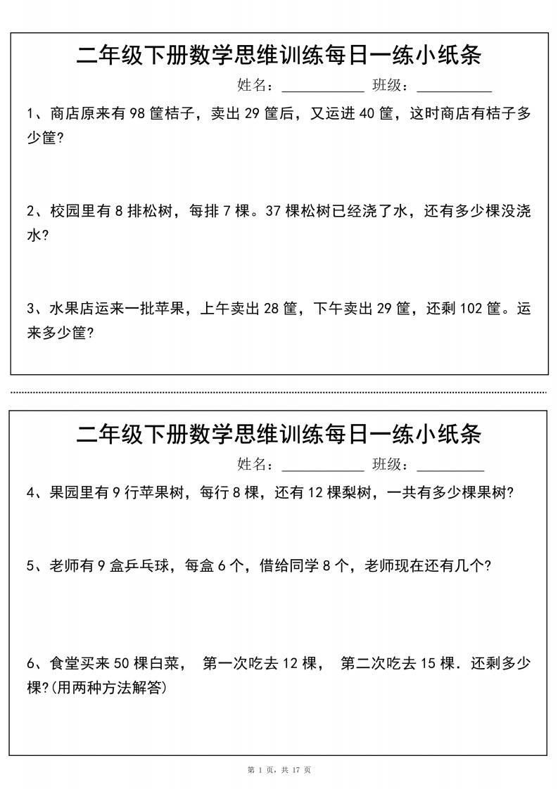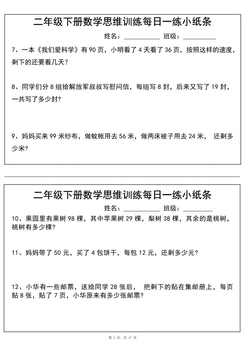 当前位置: 首页小学资源小学二年级正文 二年级下册数学思维训练每日一练小纸条(17页34条)-高清无水印完整版本_共17页 小学二年级 1 周前 0 0 10 以上为部分内容预览,如需源文档请登录您的会员账号进行下载! 声明:本站所有文章,如无特殊说明或标注,均为本站原创发布。任何个人或组织,在未征得本站同意时,禁止复制、盗用、采集、发布本站内容到任何网站、书籍等各类媒体平台。如若本站内容侵犯了原著者的合法权益,可联系我们进行处理。 尚学资源永久会员 打赏 收藏 海报 链接