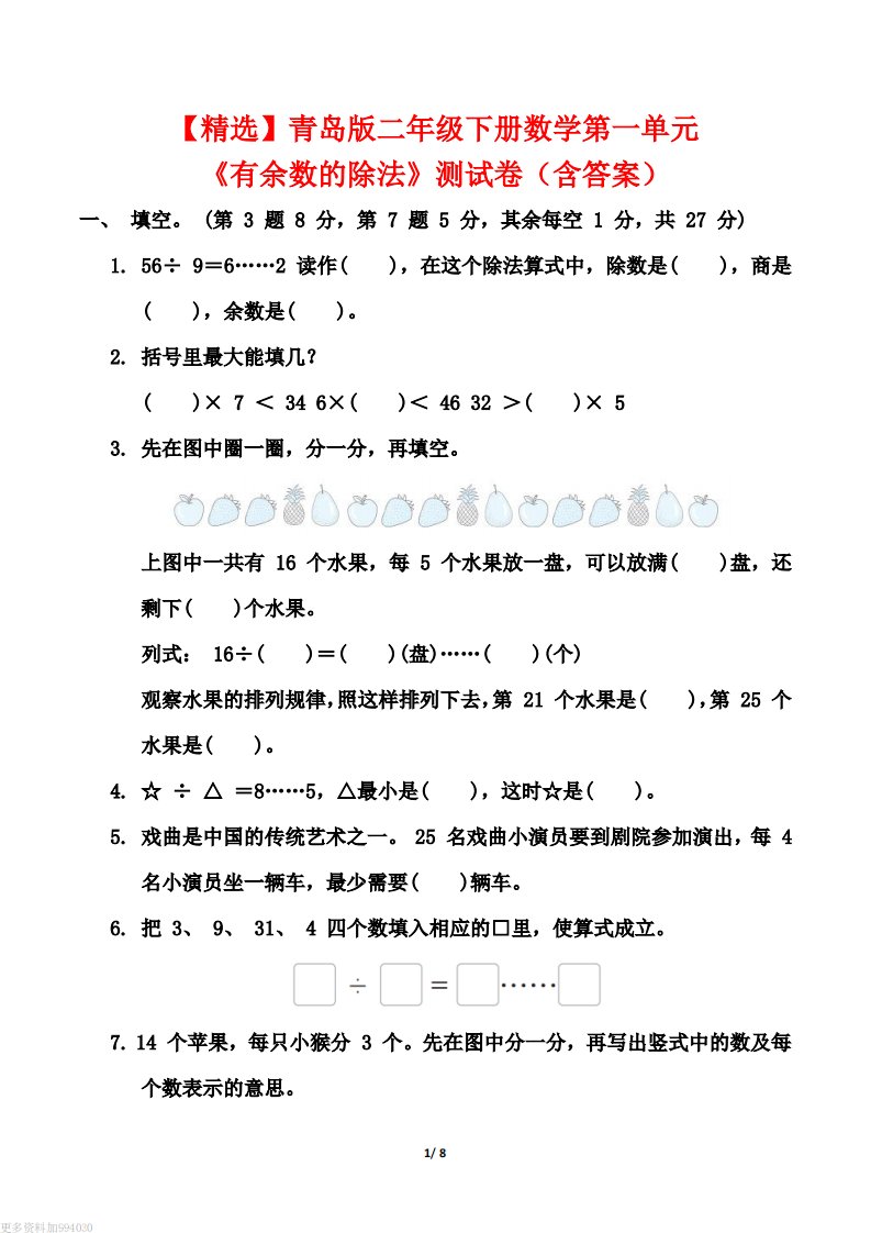 【精选】青岛63版二年级下册数学第一单元《有余数的除法》测试卷(含答案)_共8页