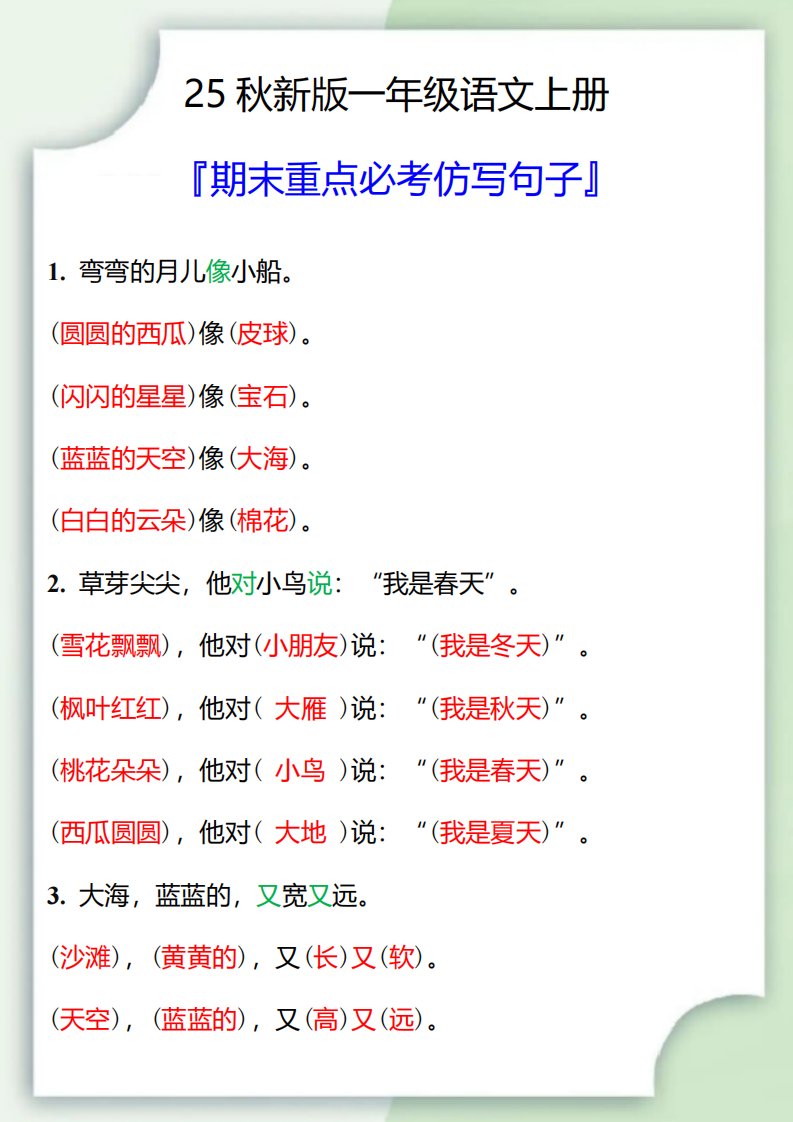 当前位置: 首页小学资源小学一年级正文 【2025秋新版】一年级语文上册期末重点必考仿写句子_共3页 小学一年级 2 周前 0 0 5 以上为部分内容预览,如需源文档请登录您的会员账号进行下载! 声明:本站所有文章,如无特殊说明或标注,均为本站原创发布。任何个人或组织,在未征得本站同意时,禁止复制、盗用、采集、发布本站内容到任何网站、书籍等各类媒体平台。如若本站内容侵犯了原著者的合法权益,可联系我们进行处理。 尚学资源永久会员 打赏 收藏 海报 链接