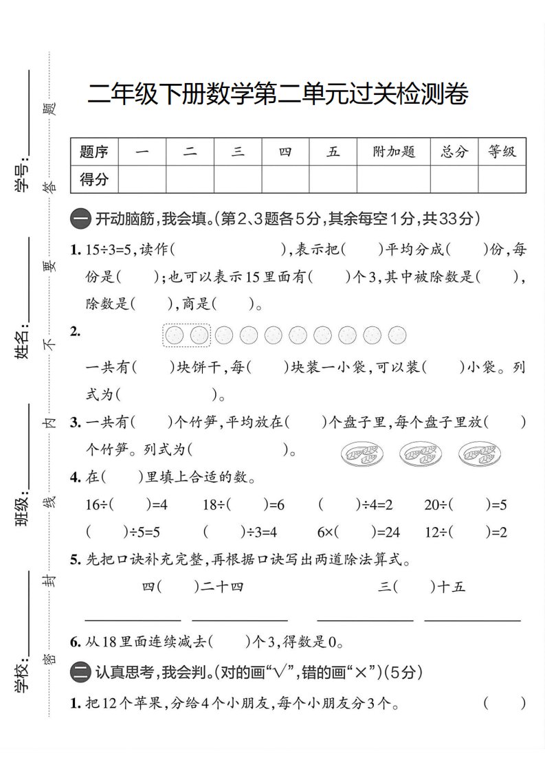 二年级下册数学单元过关测试卷人教版_共5页