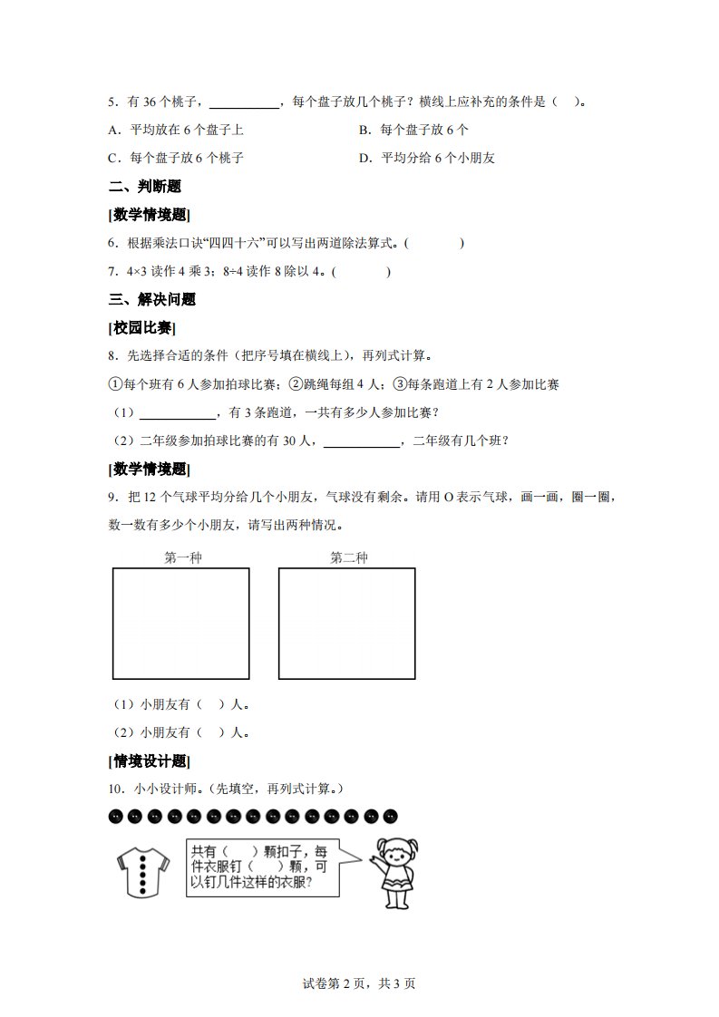 当前位置: 首页小学资源小学二年级正文 人教版数学二年级下册第二单元《表内除法(一)》情境小卷_共8页 小学二年级 1 周前 0 0 5 以上为部分内容预览,如需源文档请登录您的会员账号进行下载! 声明:本站所有文章,如无特殊说明或标注,均为本站原创发布。任何个人或组织,在未征得本站同意时,禁止复制、盗用、采集、发布本站内容到任何网站、书籍等各类媒体平台。如若本站内容侵犯了原著者的合法权益,可联系我们进行处理。 尚学资源永久会员 打赏 收藏 海报 链接