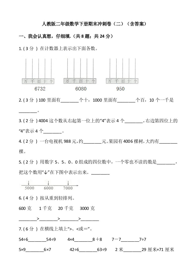 当前位置: 首页小学资源小学二年级正文 【期末】人教版二年级数学下册期末冲刺卷(二)(含答案)_共9页 小学二年级 1 周前 0 0 5 以上为部分内容预览,如需源文档请登录您的会员账号进行下载! 声明:本站所有文章,如无特殊说明或标注,均为本站原创发布。任何个人或组织,在未征得本站同意时,禁止复制、盗用、采集、发布本站内容到任何网站、书籍等各类媒体平台。如若本站内容侵犯了原著者的合法权益,可联系我们进行处理。 尚学资源永久会员 打赏 收藏 海报 链接