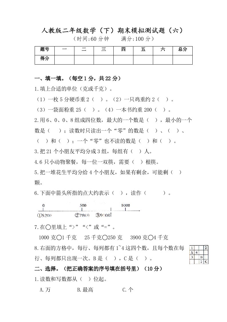 二年级数学下册试题-期末模拟测试题(六)人教版(含答案)_共5页