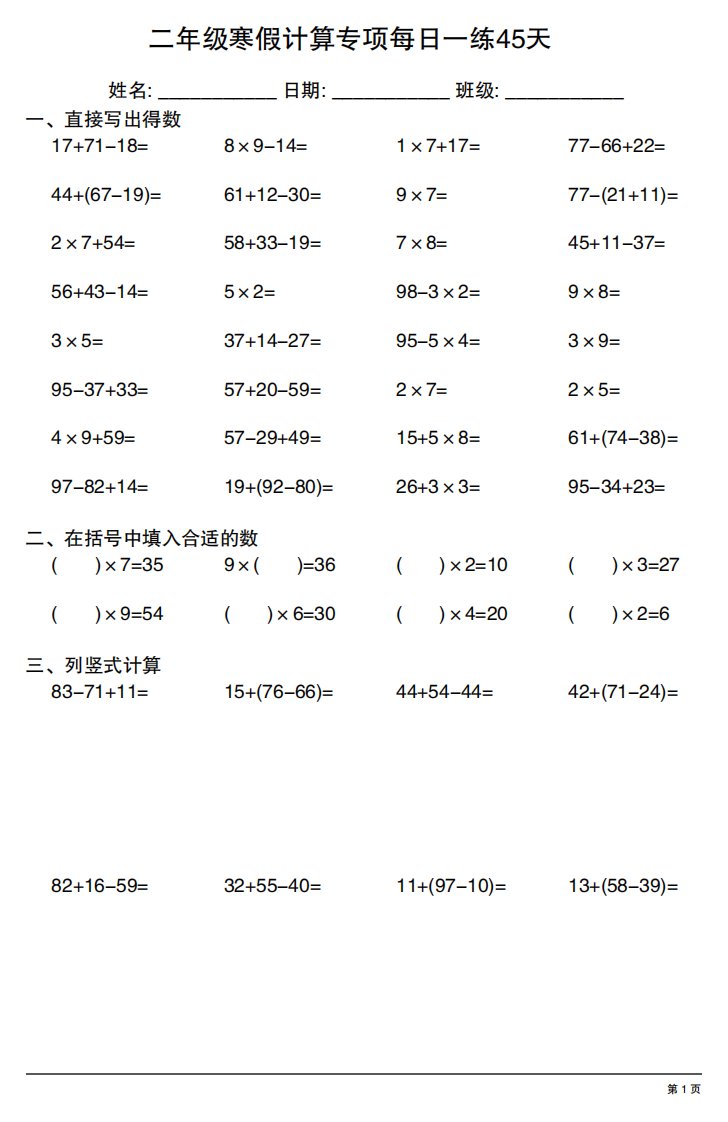 二年级下册数学寒假计算专项每日一练45天_共45页