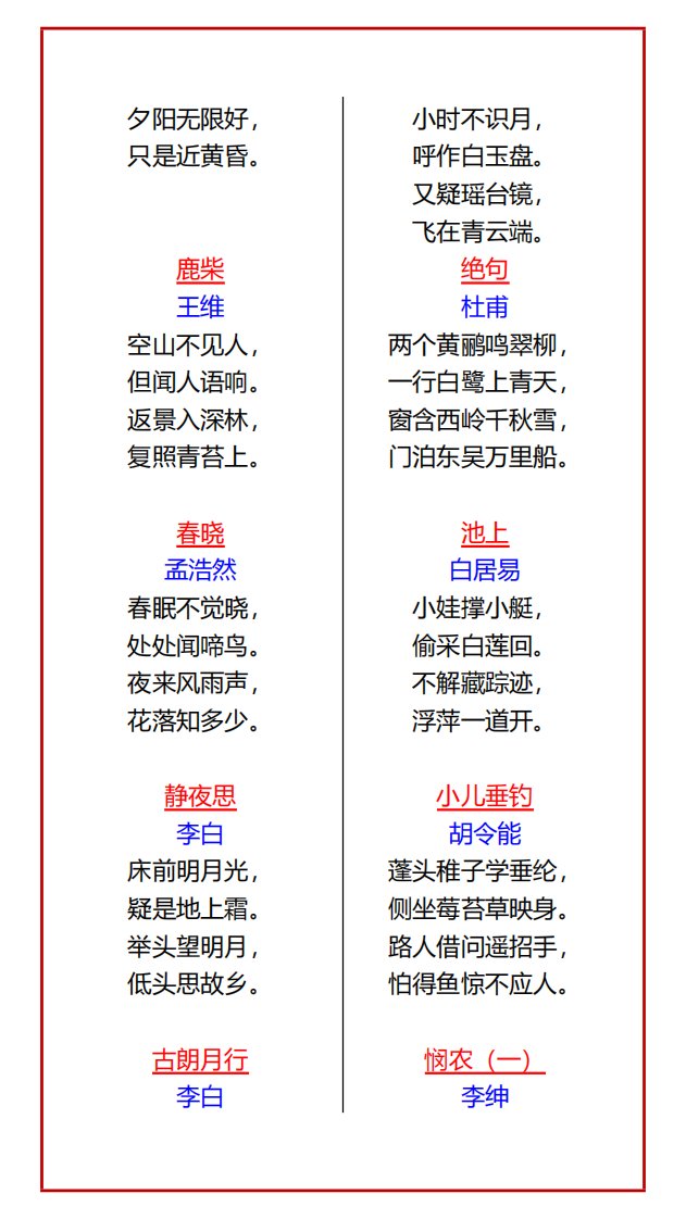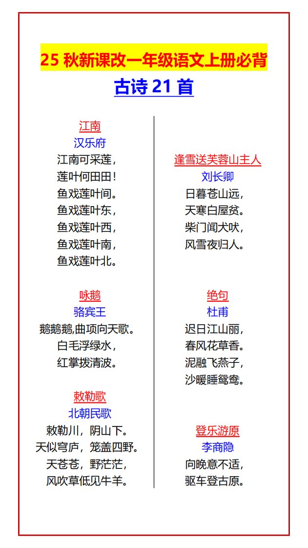 当前位置: 首页小学资源小学一年级正文 【2025秋新版】一年级语文上册必背古诗21首_共4页 小学一年级 2 周前 0 0 5 以上为部分内容预览,如需源文档请登录您的会员账号进行下载! 声明:本站所有文章,如无特殊说明或标注,均为本站原创发布。任何个人或组织,在未征得本站同意时,禁止复制、盗用、采集、发布本站内容到任何网站、书籍等各类媒体平台。如若本站内容侵犯了原著者的合法权益,可联系我们进行处理。 尚学资源永久会员 打赏 收藏 海报 链接