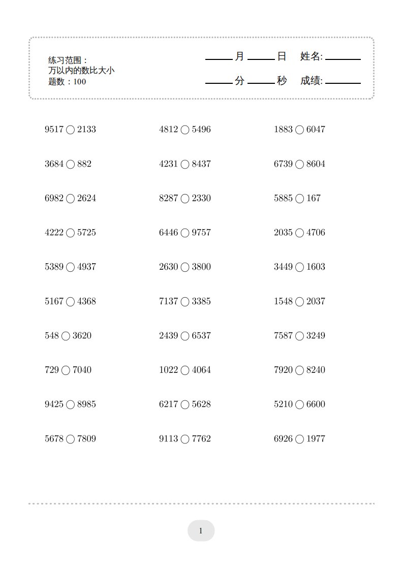 二年级数学下册口算题(万以内的数比大小)500题(人教版)_共15页