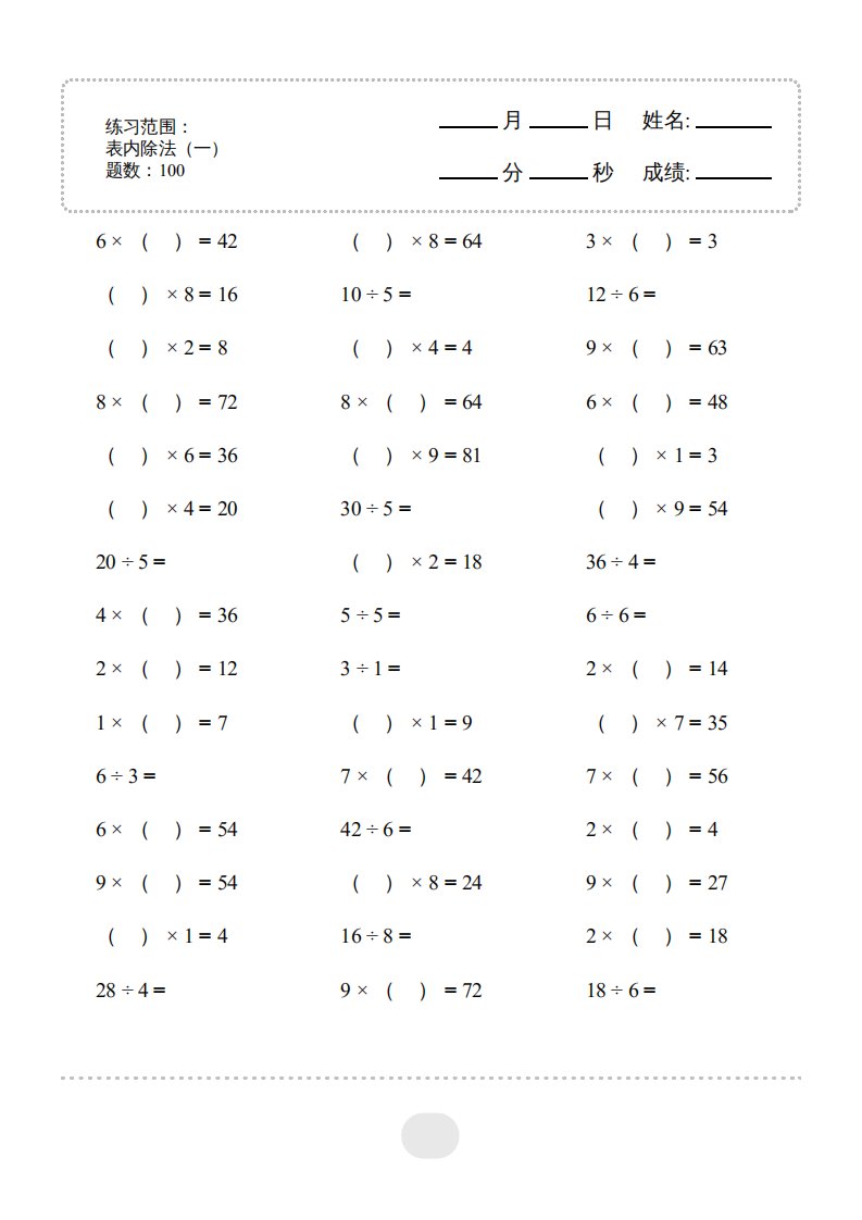二年级数学下册▲口算题(表内除法(一))连打版(人教版)_共50页