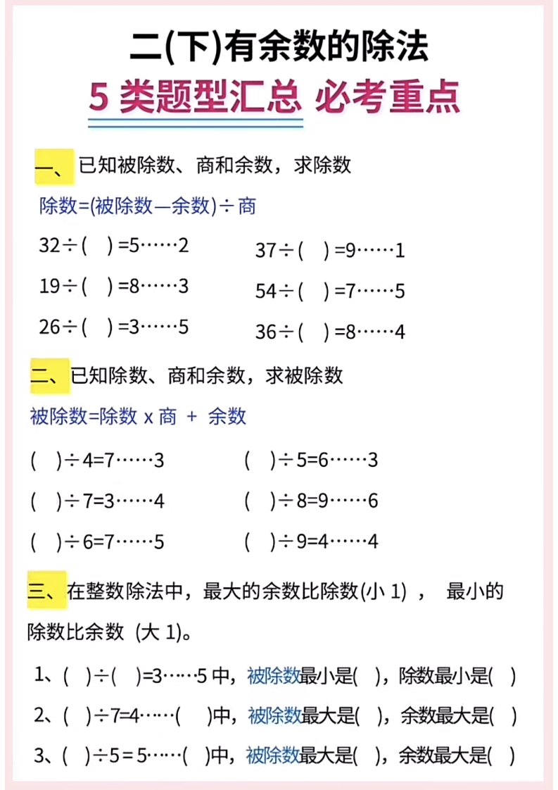 【有余数的除法】5大常考题型汇总二下数学_共9页