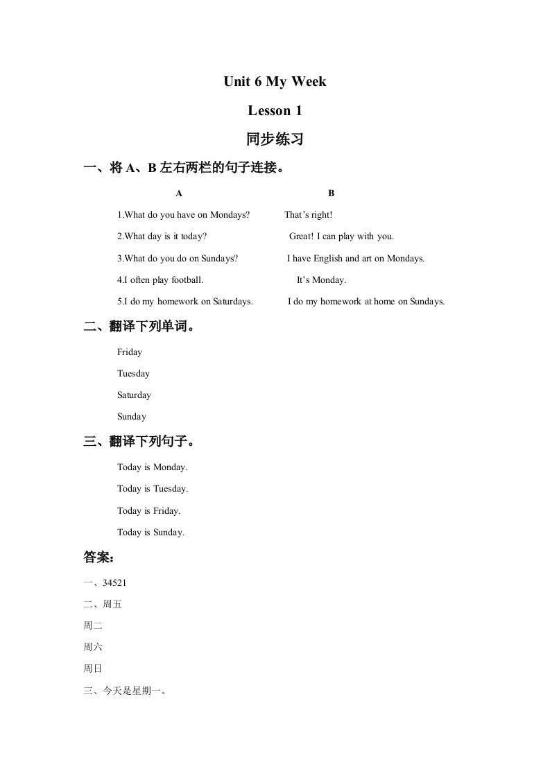 二年级英语下册Unit6MyWeekLesson1同步练习1(人教版)_共2页