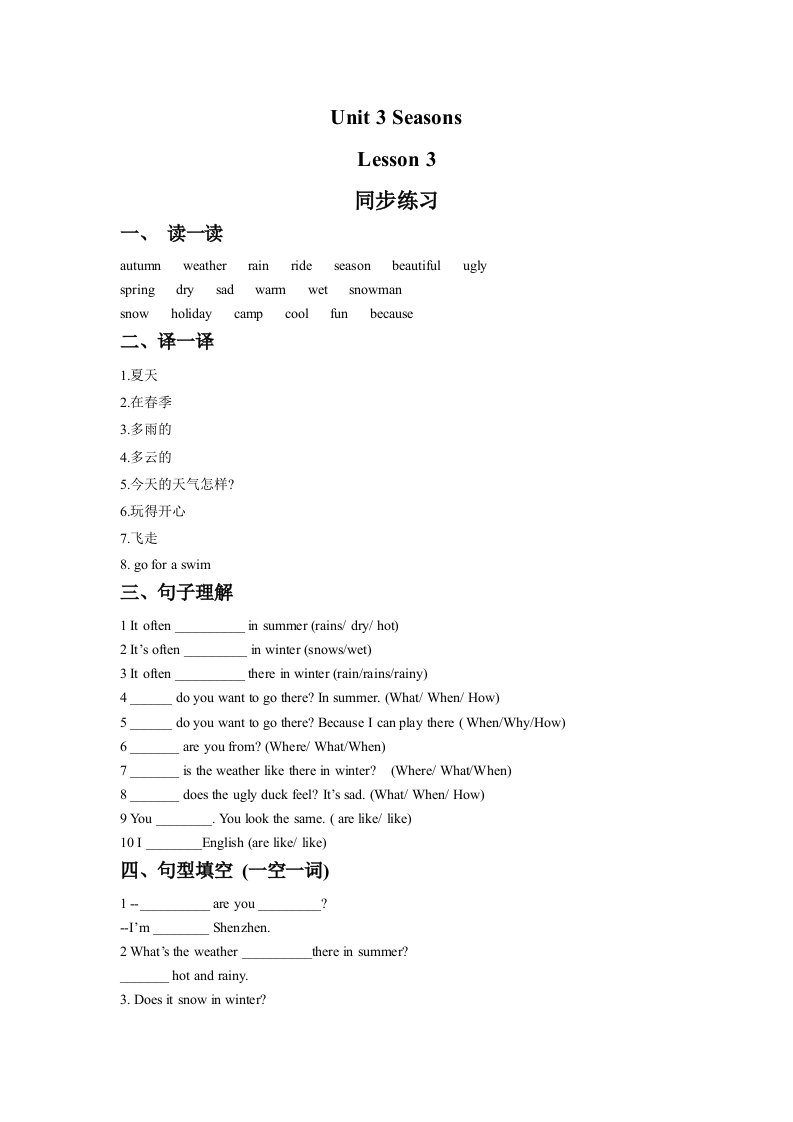 二年级英语下册Unit3SeasonsLesson3同步练习1(人教版)_共2页
