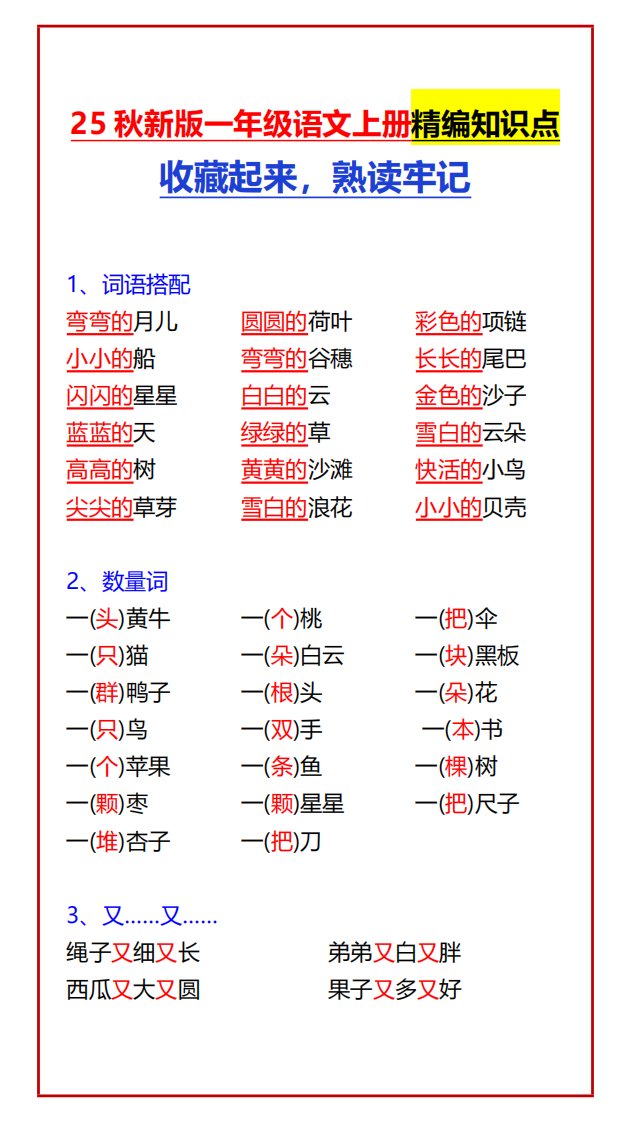 当前位置: 首页小学资源小学一年级正文 【2025秋新版】一年级语文上册精编知识点收藏起来,熟读牢记_共6页 小学一年级 2 周前 0 0 5 以上为部分内容预览,如需源文档请登录您的会员账号进行下载! 声明:本站所有文章,如无特殊说明或标注,均为本站原创发布。任何个人或组织,在未征得本站同意时,禁止复制、盗用、采集、发布本站内容到任何网站、书籍等各类媒体平台。如若本站内容侵犯了原著者的合法权益,可联系我们进行处理。 尚学资源永久会员 打赏 收藏 海报 链接