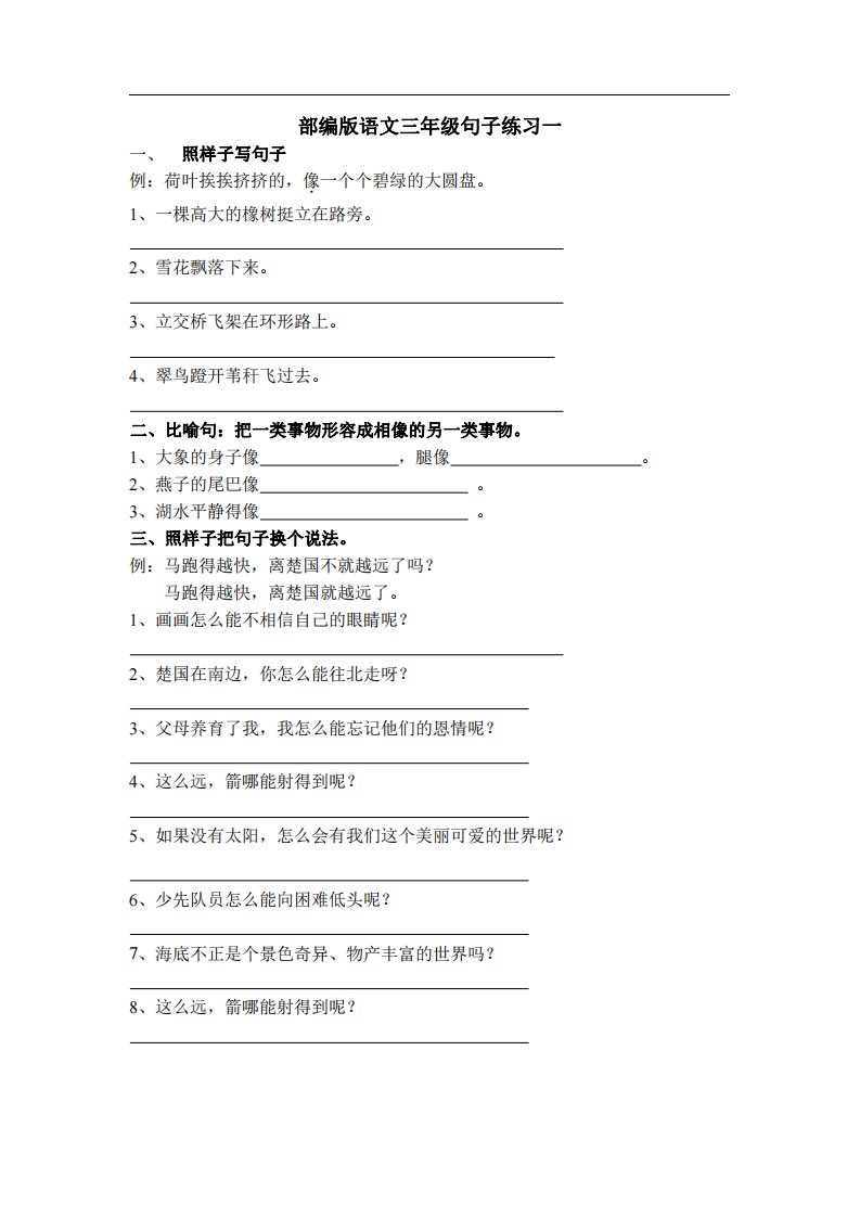 当前位置: 首页小学资源小学三年级正文 三上语文-专项练习:句子练习(无答案)_共2页 小学三年级 1 周前 0 0 5 以上为部分内容预览,如需源文档请登录您的会员账号进行下载! 声明:本站所有文章,如无特殊说明或标注,均为本站原创发布。任何个人或组织,在未征得本站同意时,禁止复制、盗用、采集、发布本站内容到任何网站、书籍等各类媒体平台。如若本站内容侵犯了原著者的合法权益,可联系我们进行处理。 尚学资源永久会员 打赏 收藏 海报 链接