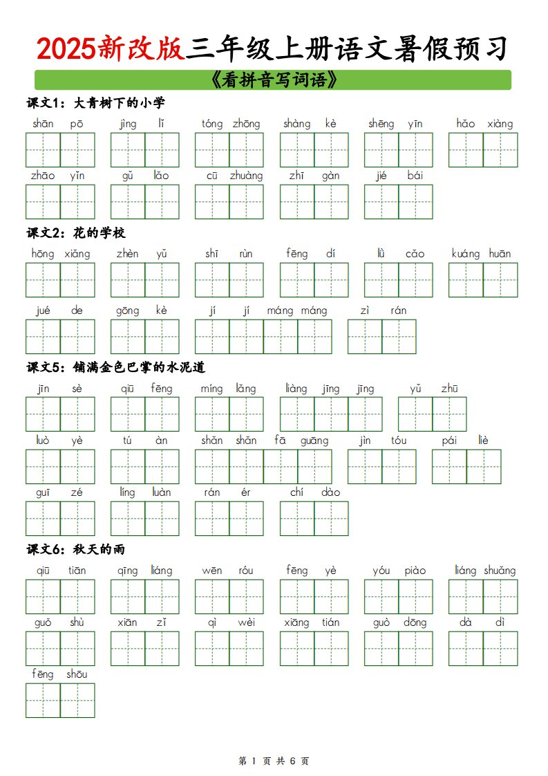 当前位置: 首页小学资源小学三年级正文 2025新版三上语文暑假预习看拼音写词语_共6页 小学三年级 1 周前 0 0 5 以上为部分内容预览,如需源文档请登录您的会员账号进行下载! 声明:本站所有文章,如无特殊说明或标注,均为本站原创发布。任何个人或组织,在未征得本站同意时,禁止复制、盗用、采集、发布本站内容到任何网站、书籍等各类媒体平台。如若本站内容侵犯了原著者的合法权益,可联系我们进行处理。 尚学资源永久会员 打赏 收藏 海报 链接