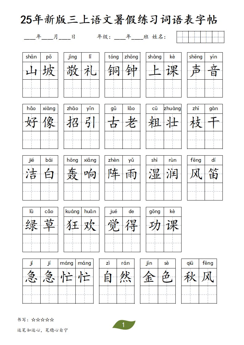 当前位置: 首页小学资源小学三年级正文 25年新版三上语文暑假练习词语表字帖_共11页 小学三年级 1 周前 0 0 10 以上为部分内容预览,如需源文档请登录您的会员账号进行下载! 声明:本站所有文章,如无特殊说明或标注,均为本站原创发布。任何个人或组织,在未征得本站同意时,禁止复制、盗用、采集、发布本站内容到任何网站、书籍等各类媒体平台。如若本站内容侵犯了原著者的合法权益,可联系我们进行处理。 尚学资源永久会员 打赏 收藏 海报 链接