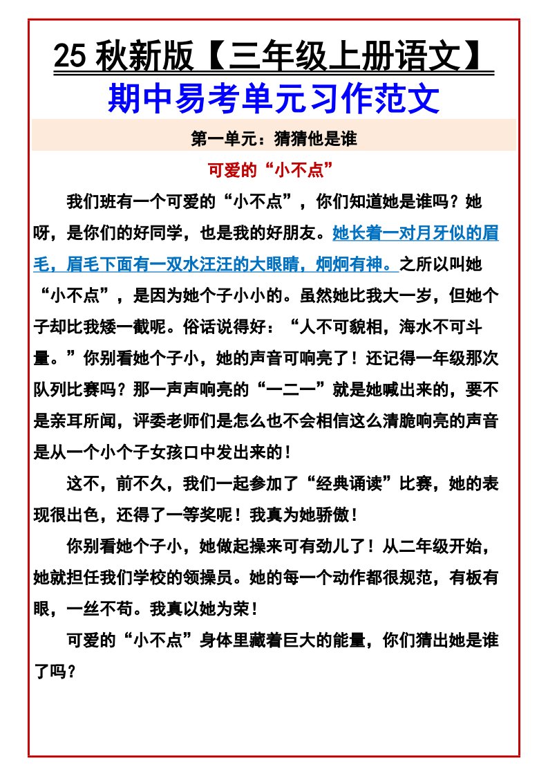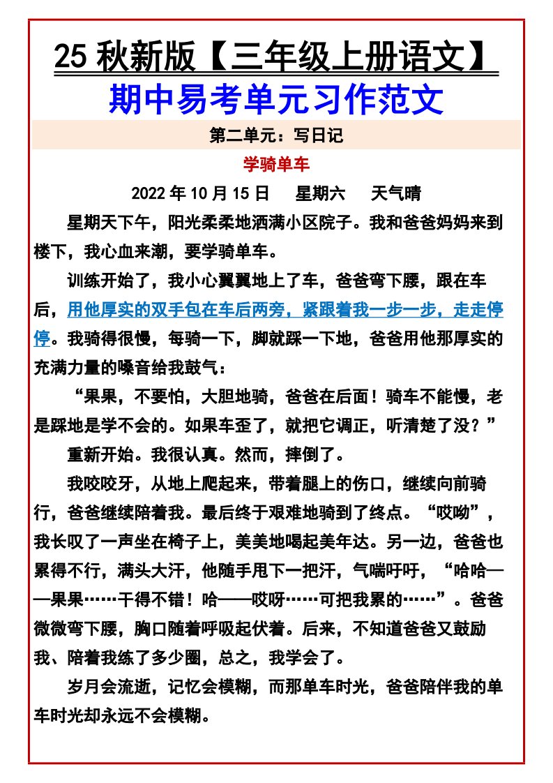 当前位置: 首页小学资源小学三年级正文 【2025秋新版】【三年级上册语文】期中易考单元习作范文_共4页 小学三年级 1 周前 0 0 5 以上为部分内容预览,如需源文档请登录您的会员账号进行下载! 声明:本站所有文章,如无特殊说明或标注,均为本站原创发布。任何个人或组织,在未征得本站同意时,禁止复制、盗用、采集、发布本站内容到任何网站、书籍等各类媒体平台。如若本站内容侵犯了原著者的合法权益,可联系我们进行处理。 尚学资源永久会员 打赏 收藏 海报 链接