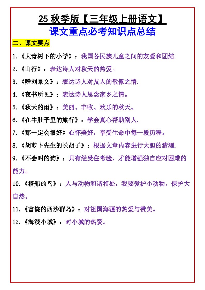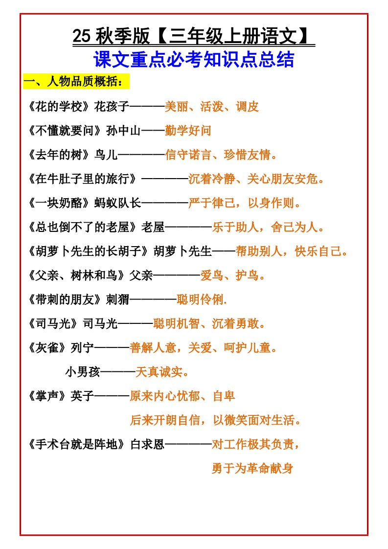 当前位置: 首页小学资源小学三年级正文 【2025秋新版】【三年级上册语文】课文重点必考知识点总结_共2页 小学三年级 1 周前 0 0 5 以上为部分内容预览,如需源文档请登录您的会员账号进行下载! 声明:本站所有文章,如无特殊说明或标注,均为本站原创发布。任何个人或组织,在未征得本站同意时,禁止复制、盗用、采集、发布本站内容到任何网站、书籍等各类媒体平台。如若本站内容侵犯了原著者的合法权益,可联系我们进行处理。 尚学资源永久会员 打赏 收藏 海报 链接