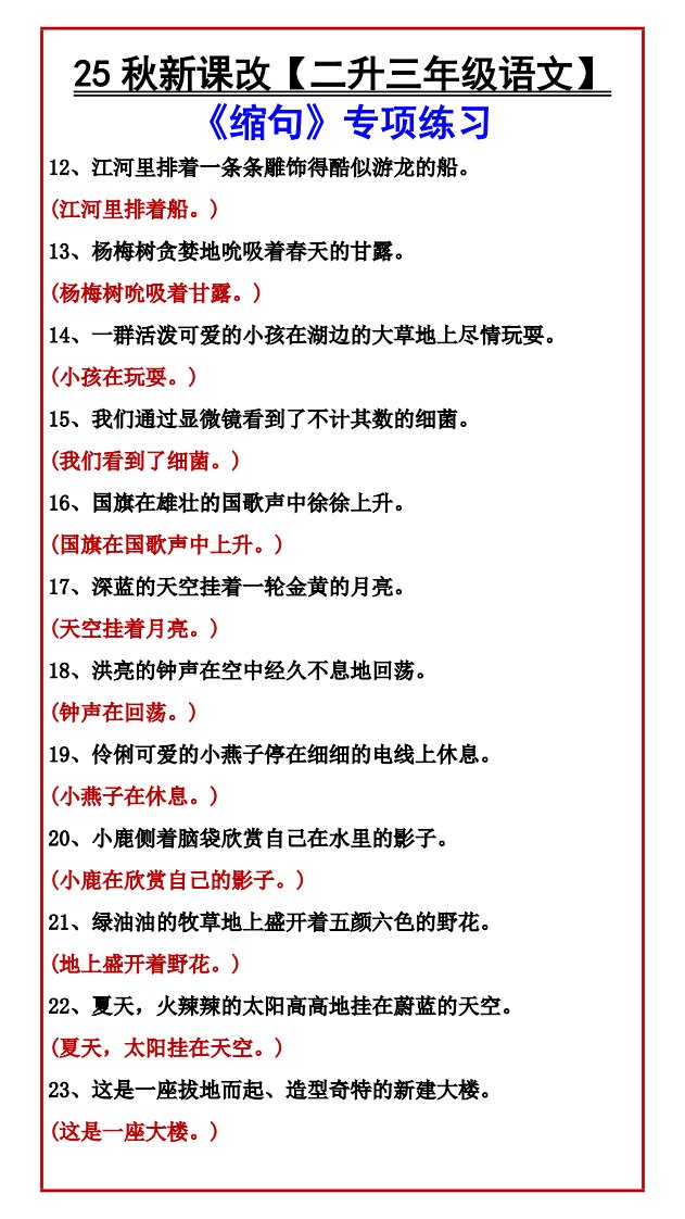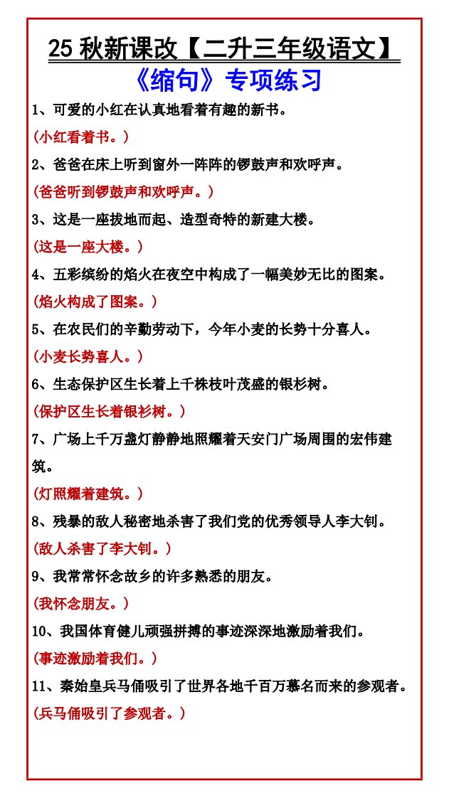 当前位置: 首页小学资源小学三年级正文 【2025秋新版】【二升三年级语文】《缩句》专项练习-三上语文_共4页 小学三年级 1 周前 0 0 5 以上为部分内容预览,如需源文档请登录您的会员账号进行下载! 声明:本站所有文章,如无特殊说明或标注,均为本站原创发布。任何个人或组织,在未征得本站同意时,禁止复制、盗用、采集、发布本站内容到任何网站、书籍等各类媒体平台。如若本站内容侵犯了原著者的合法权益,可联系我们进行处理。 尚学资源永久会员 打赏 收藏 海报 链接