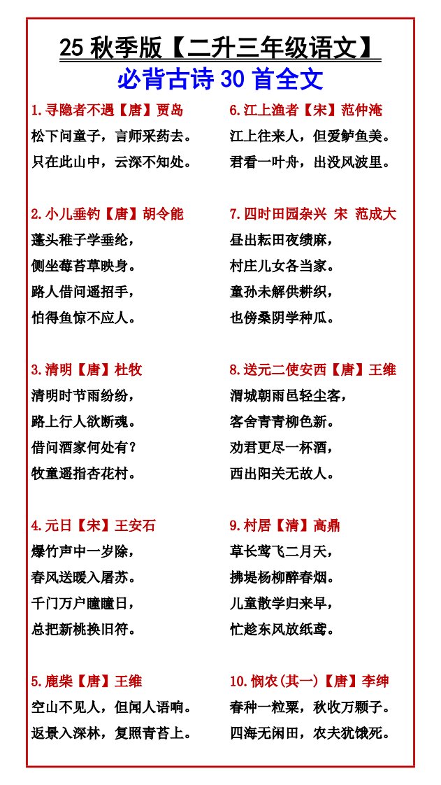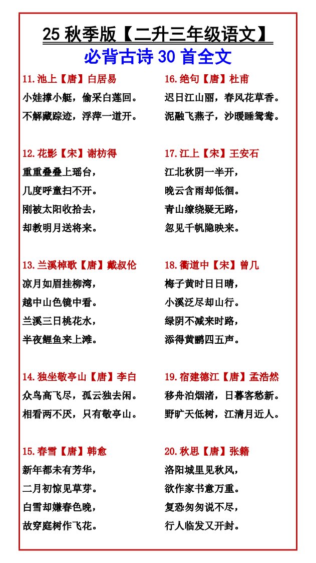 【2025秋新版】【二升三年级语文】必背古诗30首全文-三上语文_共6页