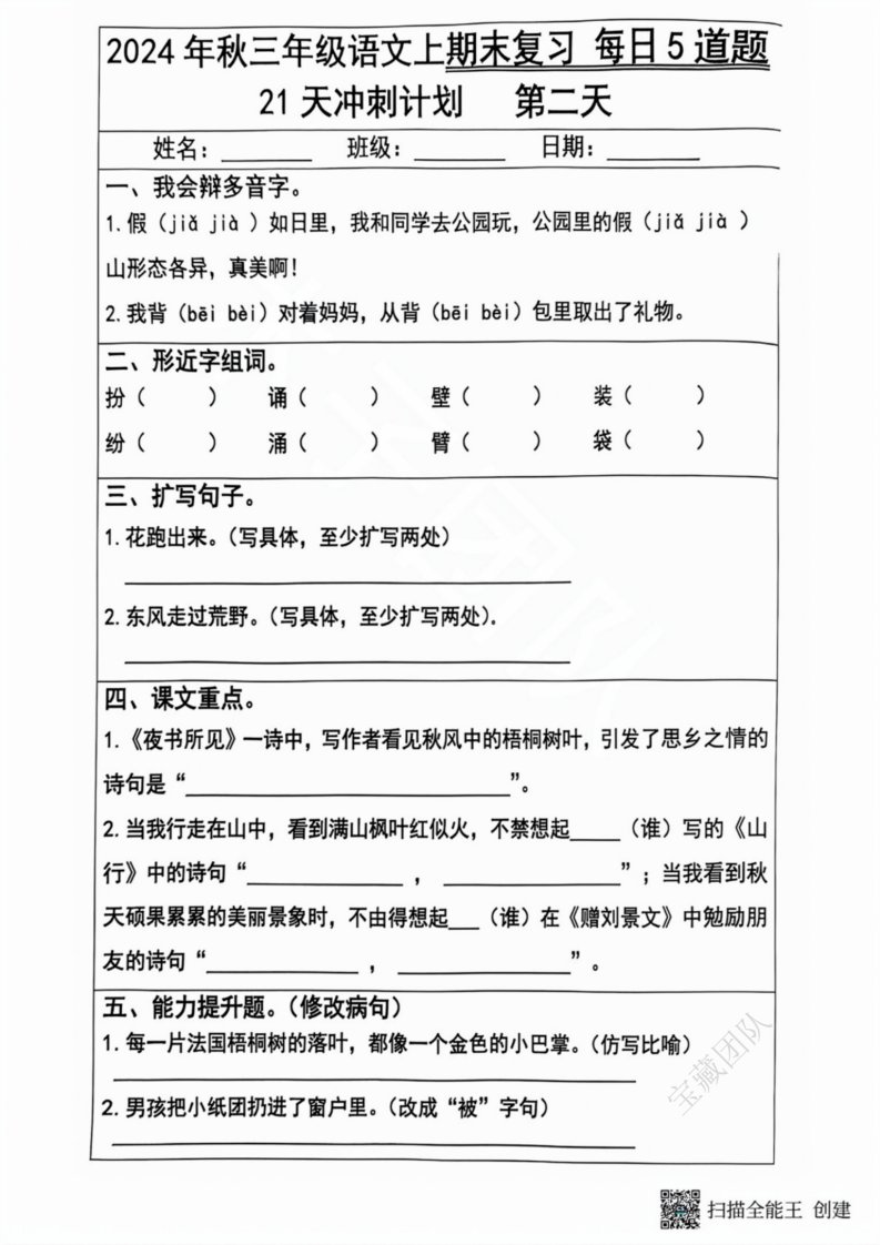 当前位置: 首页小学资源小学三年级正文 2024秋三年级语文上册期末复习每日5题(21天冲刺计划)_共23页 小学三年级 1 周前 0 0 15 以上为部分内容预览,如需源文档请登录您的会员账号进行下载! 声明:本站所有文章,如无特殊说明或标注,均为本站原创发布。任何个人或组织,在未征得本站同意时,禁止复制、盗用、采集、发布本站内容到任何网站、书籍等各类媒体平台。如若本站内容侵犯了原著者的合法权益,可联系我们进行处理。 尚学资源永久会员 打赏 收藏 海报 链接