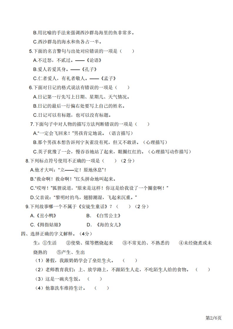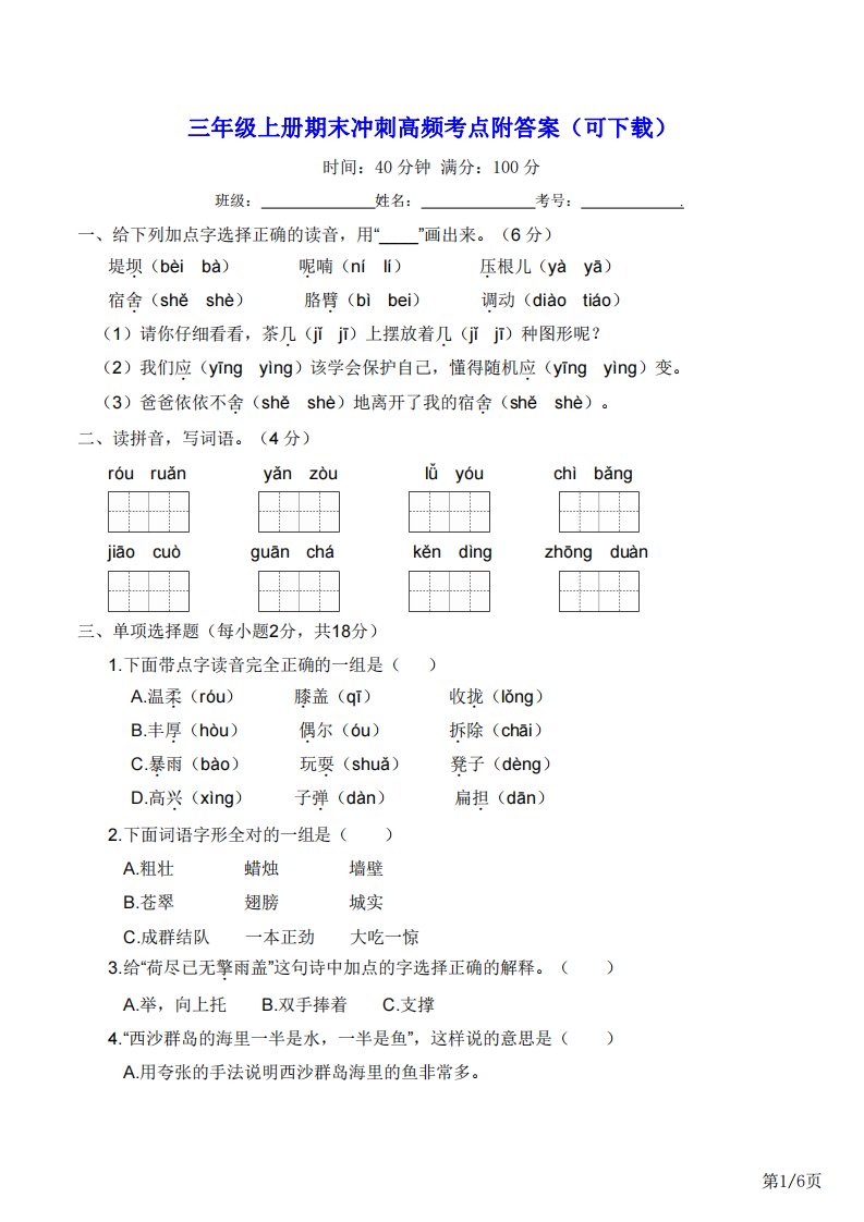 三年级上册语文期末冲刺高频考点附答案(可下载)_共6页