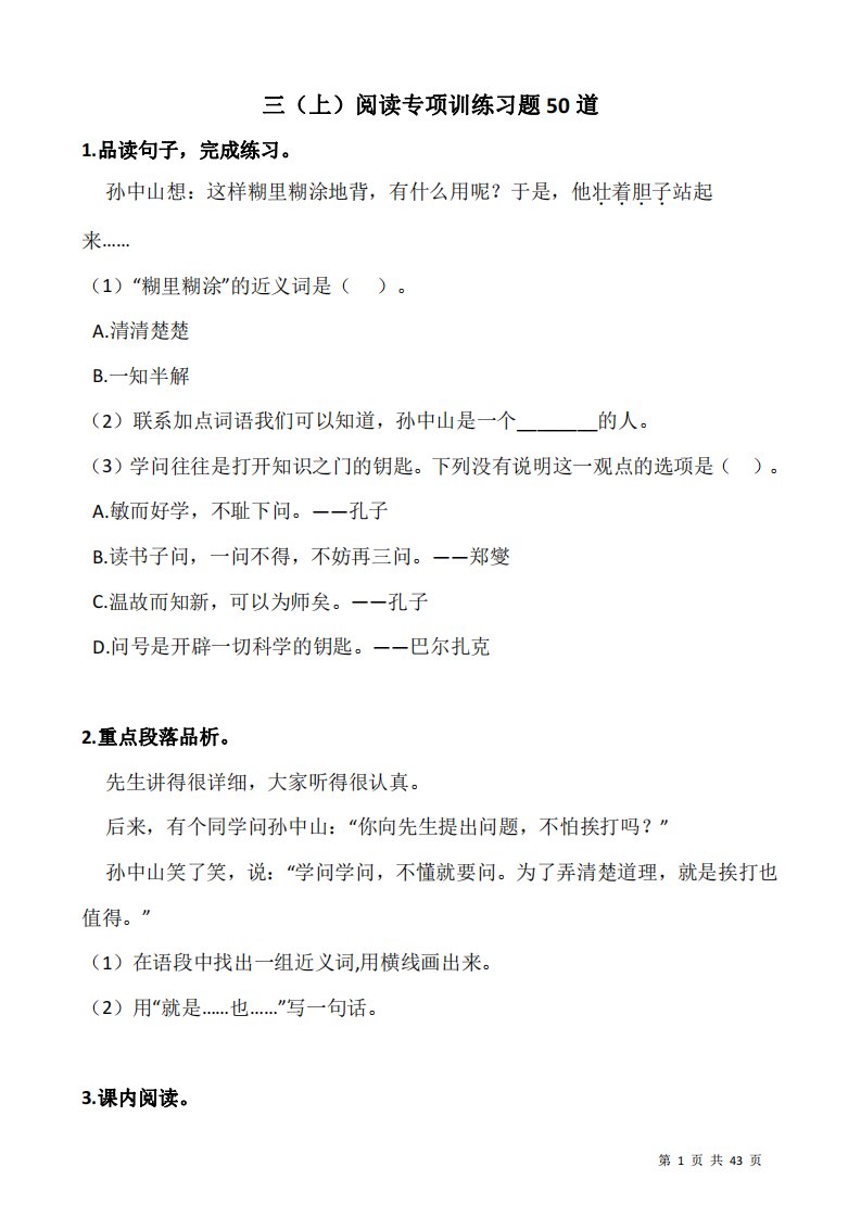 当前位置: 首页小学资源小学三年级正文 三上语文阅读专项训练习题50道_共43页 小学三年级 1 周前 0 0 15 以上为部分内容预览,如需源文档请登录您的会员账号进行下载! 声明:本站所有文章,如无特殊说明或标注,均为本站原创发布。任何个人或组织,在未征得本站同意时,禁止复制、盗用、采集、发布本站内容到任何网站、书籍等各类媒体平台。如若本站内容侵犯了原著者的合法权益,可联系我们进行处理。 尚学资源永久会员 打赏 收藏 海报 链接