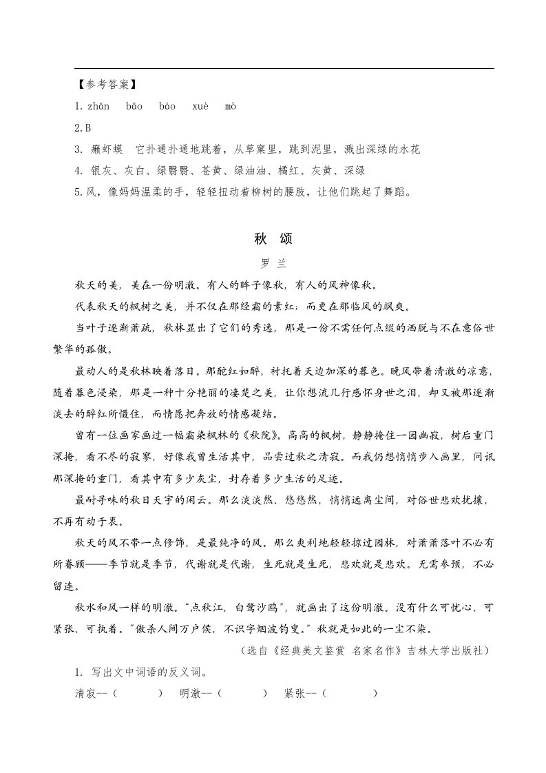 当前位置: 首页小学资源小学三年级正文 三年级语文上册类文阅读6秋天的雨(部编版)_共3页 小学三年级 1 周前 0 0 5 以上为部分内容预览,如需源文档请登录您的会员账号进行下载! 声明:本站所有文章,如无特殊说明或标注,均为本站原创发布。任何个人或组织,在未征得本站同意时,禁止复制、盗用、采集、发布本站内容到任何网站、书籍等各类媒体平台。如若本站内容侵犯了原著者的合法权益,可联系我们进行处理。 尚学资源永久会员 打赏 收藏 海报 链接