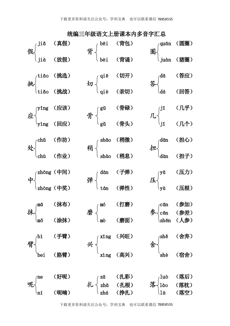 当前位置: 首页小学资源小学三年级正文 三年级语文上册课本内多音字汇总(部编版)_共2页 小学三年级 1 周前 0 0 5 以上为部分内容预览,如需源文档请登录您的会员账号进行下载! 声明:本站所有文章,如无特殊说明或标注,均为本站原创发布。任何个人或组织,在未征得本站同意时,禁止复制、盗用、采集、发布本站内容到任何网站、书籍等各类媒体平台。如若本站内容侵犯了原著者的合法权益,可联系我们进行处理。 尚学资源永久会员 打赏 收藏 海报 链接