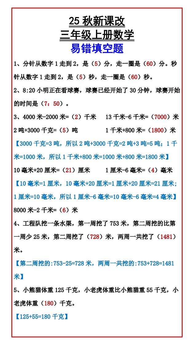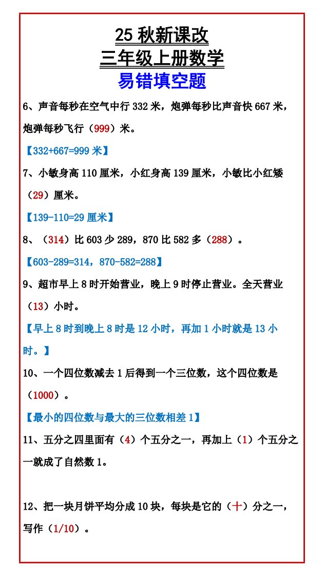 【2025秋新版】三年级上册数学易错填空题_共3页