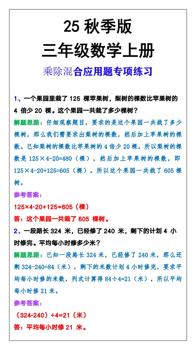 当前位置: 首页小学资源小学三年级正文 【2025秋新版】三年级上册数学乘除混合应用题_共3页 小学三年级 1 周前 0 0 5 以上为部分内容预览,如需源文档请登录您的会员账号进行下载! 声明:本站所有文章,如无特殊说明或标注,均为本站原创发布。任何个人或组织,在未征得本站同意时,禁止复制、盗用、采集、发布本站内容到任何网站、书籍等各类媒体平台。如若本站内容侵犯了原著者的合法权益,可联系我们进行处理。 尚学资源永久会员 打赏 收藏 海报 链接