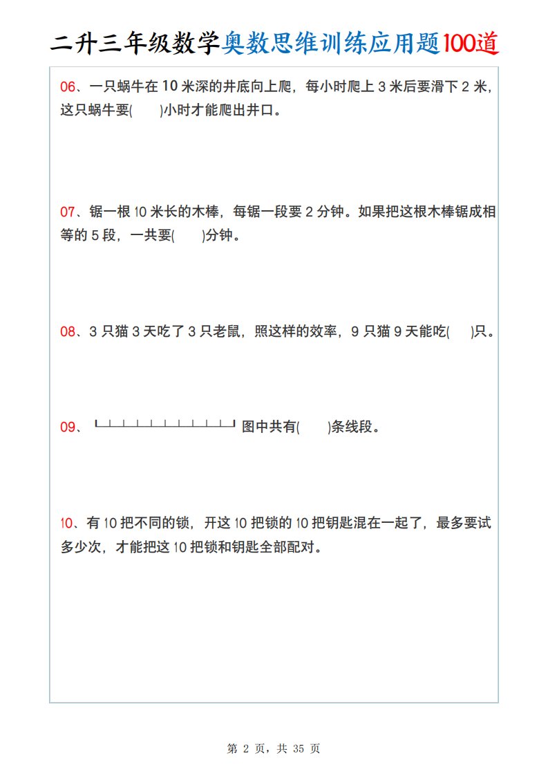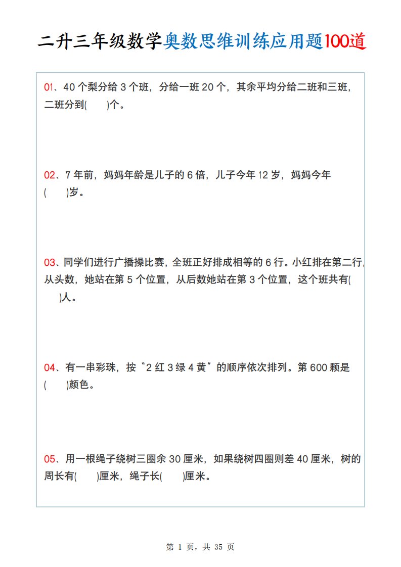 当前位置: 首页小学资源小学三年级正文 二升三年级数学奥数思维训练应用题100道(含答案35页)-三上数学_共35页 小学三年级 1 周前 0 0 15 以上为部分内容预览,如需源文档请登录您的会员账号进行下载! 声明:本站所有文章,如无特殊说明或标注,均为本站原创发布。任何个人或组织,在未征得本站同意时,禁止复制、盗用、采集、发布本站内容到任何网站、书籍等各类媒体平台。如若本站内容侵犯了原著者的合法权益,可联系我们进行处理。 尚学资源永久会员 打赏 收藏 海报 链接
