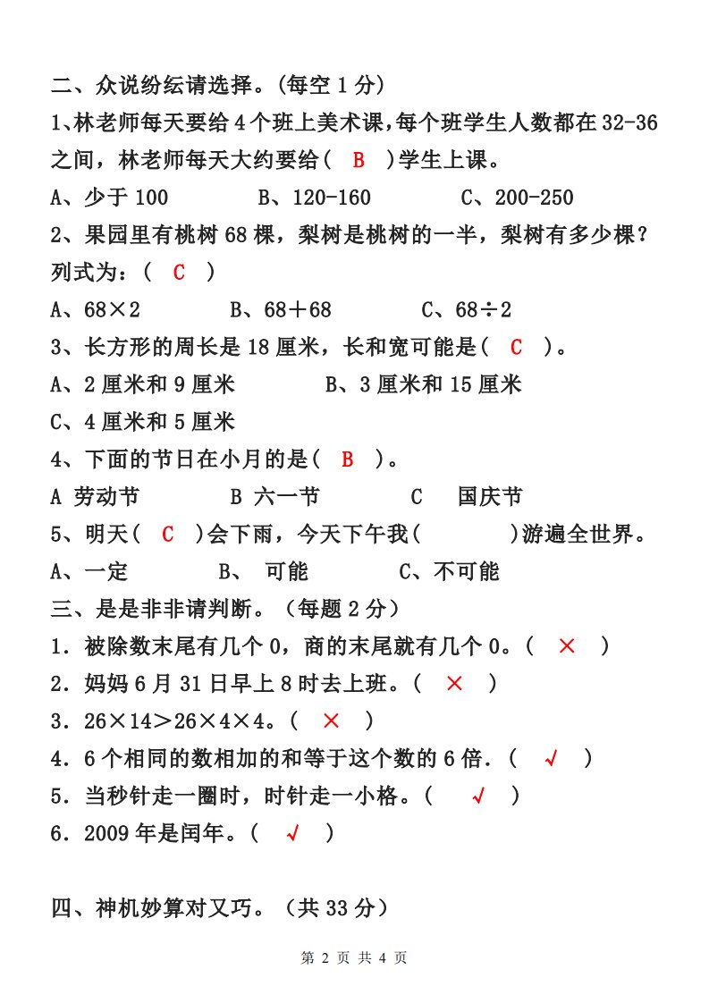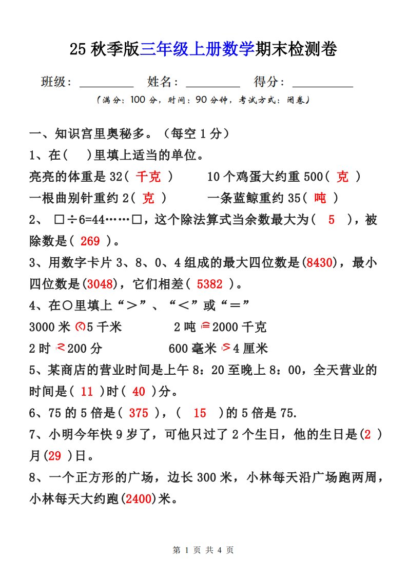 【2025秋新版】三年级上册数学期末检测卷_共4页