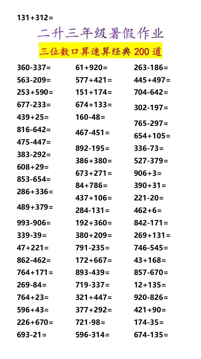 当前位置: 首页小学资源小学三年级正文 二升三年级暑假作业三位数口算速算经典200道-三上数学_共4页 小学三年级 1 周前 0 0 5 以上为部分内容预览,如需源文档请登录您的会员账号进行下载! 声明:本站所有文章,如无特殊说明或标注,均为本站原创发布。任何个人或组织,在未征得本站同意时,禁止复制、盗用、采集、发布本站内容到任何网站、书籍等各类媒体平台。如若本站内容侵犯了原著者的合法权益,可联系我们进行处理。 尚学资源永久会员 打赏 收藏 海报 链接