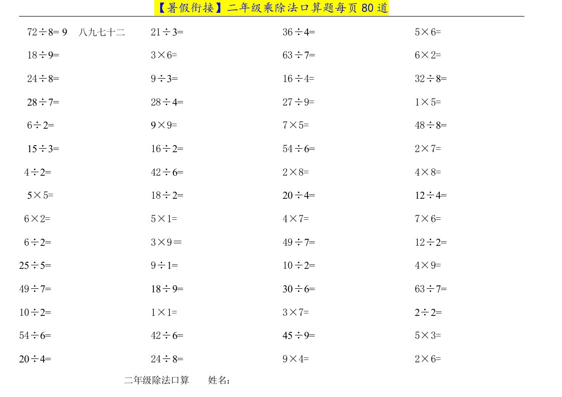 二升三年级数学暑假衔接乘除法口算题-三上数学_共9页