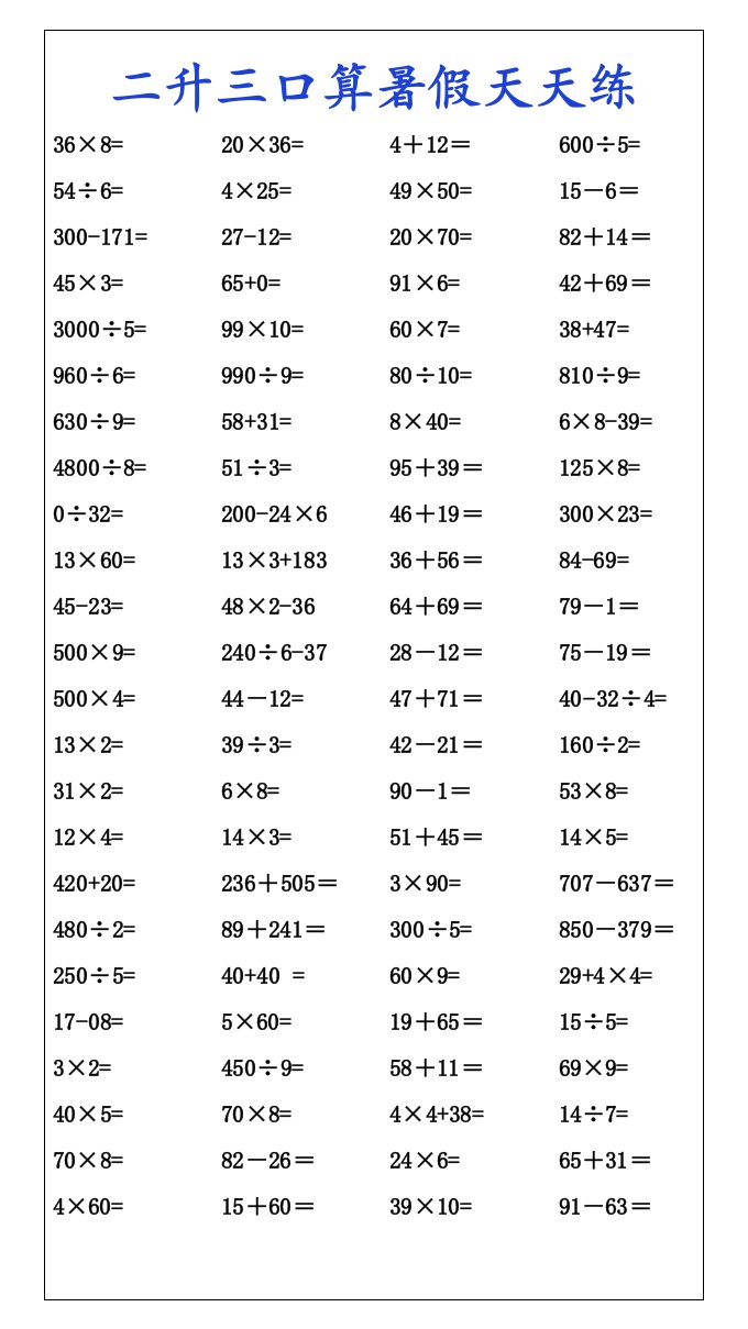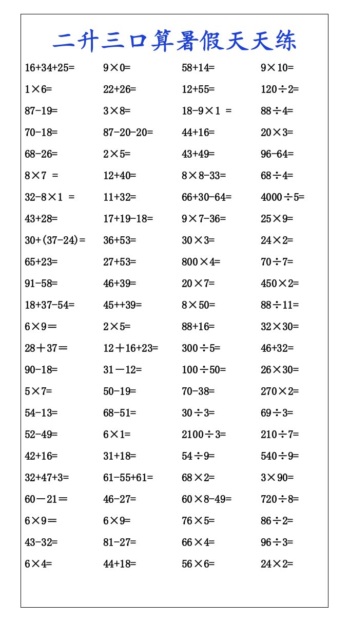 当前位置: 首页小学资源小学三年级正文 二升三口算暑假天天练-三上数学_共4页 小学三年级 1 周前 0 0 5 以上为部分内容预览,如需源文档请登录您的会员账号进行下载! 声明:本站所有文章,如无特殊说明或标注,均为本站原创发布。任何个人或组织,在未征得本站同意时,禁止复制、盗用、采集、发布本站内容到任何网站、书籍等各类媒体平台。如若本站内容侵犯了原著者的合法权益,可联系我们进行处理。 尚学资源永久会员 打赏 收藏 海报 链接