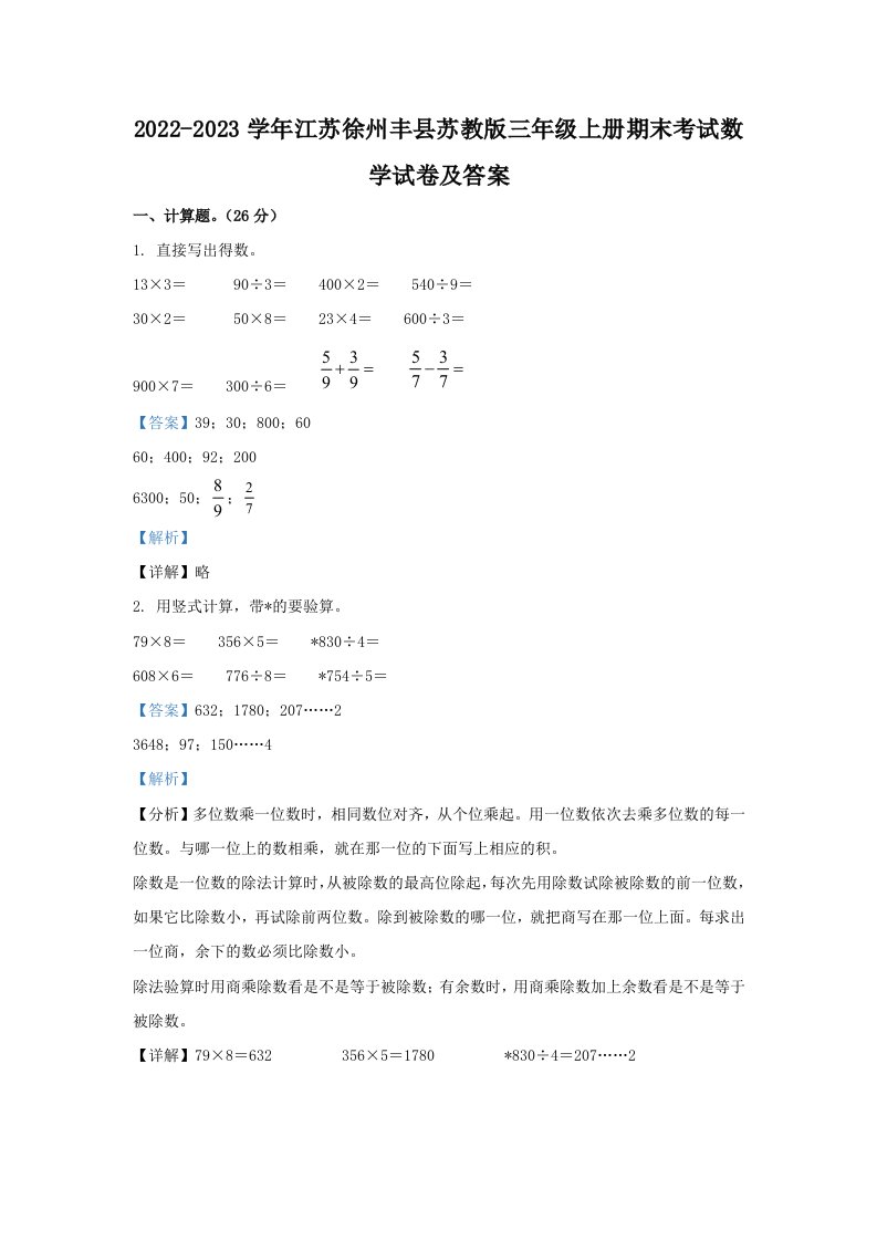 2022-2023学年江苏徐州丰县苏教版三年级上册期末考试数学试卷及答案(Word版)_共16页