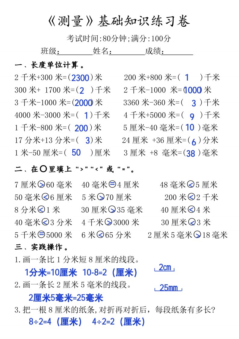 三年级上册《数学测量必背重点内容及练习》_共7页