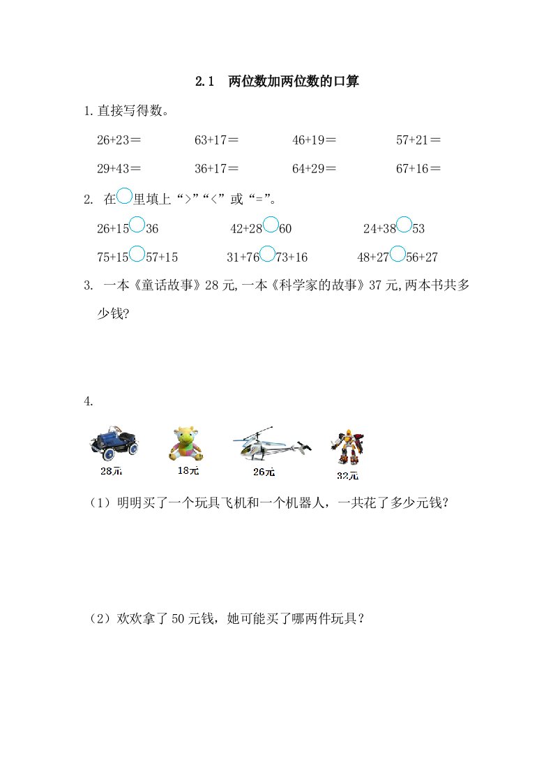 当前位置: 首页小学资源小学三年级正文 三年级数学上册2.1两位数加两位数的口算(人教版)_共2页 小学三年级 1 周前 0 0 5 以上为部分内容预览,如需源文档请登录您的会员账号进行下载! 声明:本站所有文章,如无特殊说明或标注,均为本站原创发布。任何个人或组织,在未征得本站同意时,禁止复制、盗用、采集、发布本站内容到任何网站、书籍等各类媒体平台。如若本站内容侵犯了原著者的合法权益,可联系我们进行处理。 尚学资源永久会员 打赏 收藏 海报 链接