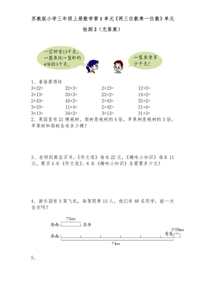 三年级数学上册第1单元《两三位数乘一位数》单元检测2(无答案)(苏教版)_共2页
