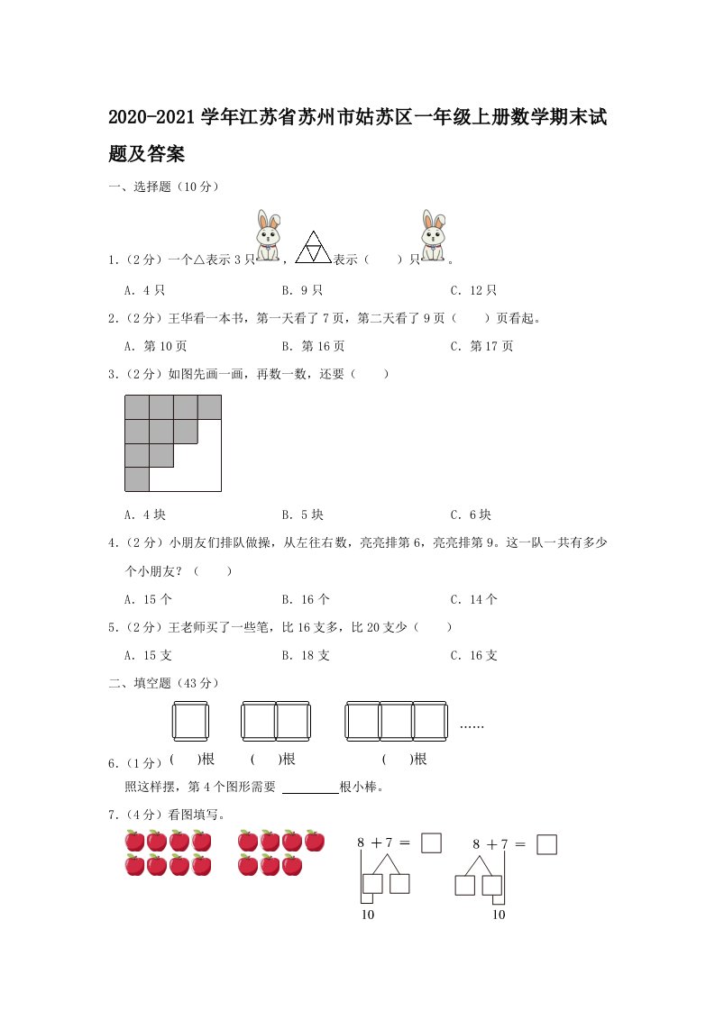 当前位置: 首页小学资源小学一年级正文 2020-2021学年江苏省苏州市姑苏区一年级上册数学期末试题及答案(Word版)_共15页 小学一年级 2 周前 0 0 10 以上为部分内容预览,如需源文档请登录您的会员账号进行下载! 声明:本站所有文章,如无特殊说明或标注,均为本站原创发布。任何个人或组织,在未征得本站同意时,禁止复制、盗用、采集、发布本站内容到任何网站、书籍等各类媒体平台。如若本站内容侵犯了原著者的合法权益,可联系我们进行处理。 尚学资源永久会员 打赏 收藏 海报 链接