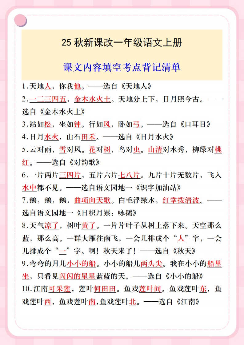 当前位置: 首页小学资源小学一年级正文 【2025秋新版】一年级语文上册课文内容填空考点背记清单_共4页 小学一年级 2 周前 0 0 5 以上为部分内容预览,如需源文档请登录您的会员账号进行下载! 声明:本站所有文章,如无特殊说明或标注,均为本站原创发布。任何个人或组织,在未征得本站同意时,禁止复制、盗用、采集、发布本站内容到任何网站、书籍等各类媒体平台。如若本站内容侵犯了原著者的合法权益,可联系我们进行处理。 尚学资源永久会员 打赏 收藏 海报 链接