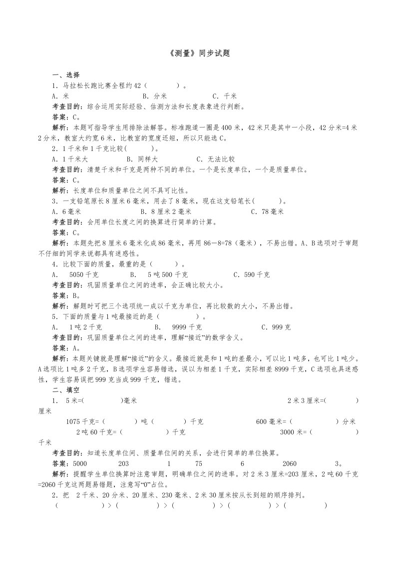 三年级数学上册《测量》同步试题(人教版)_共6页