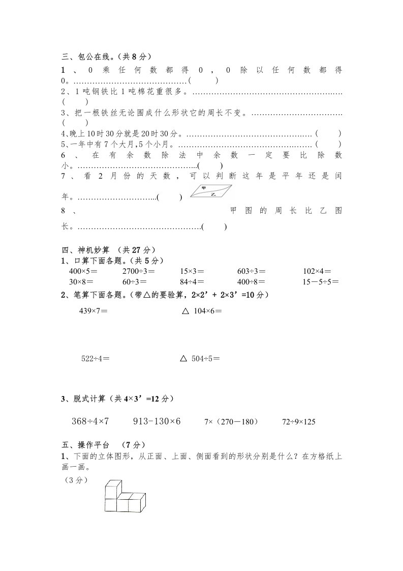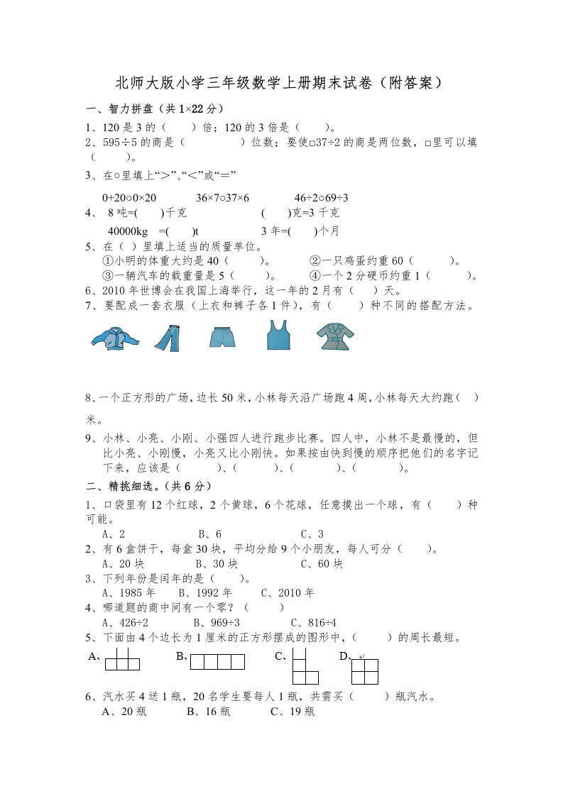 三年级数学上册小学期末试卷(附答案)(5)(北师大版)_共15页